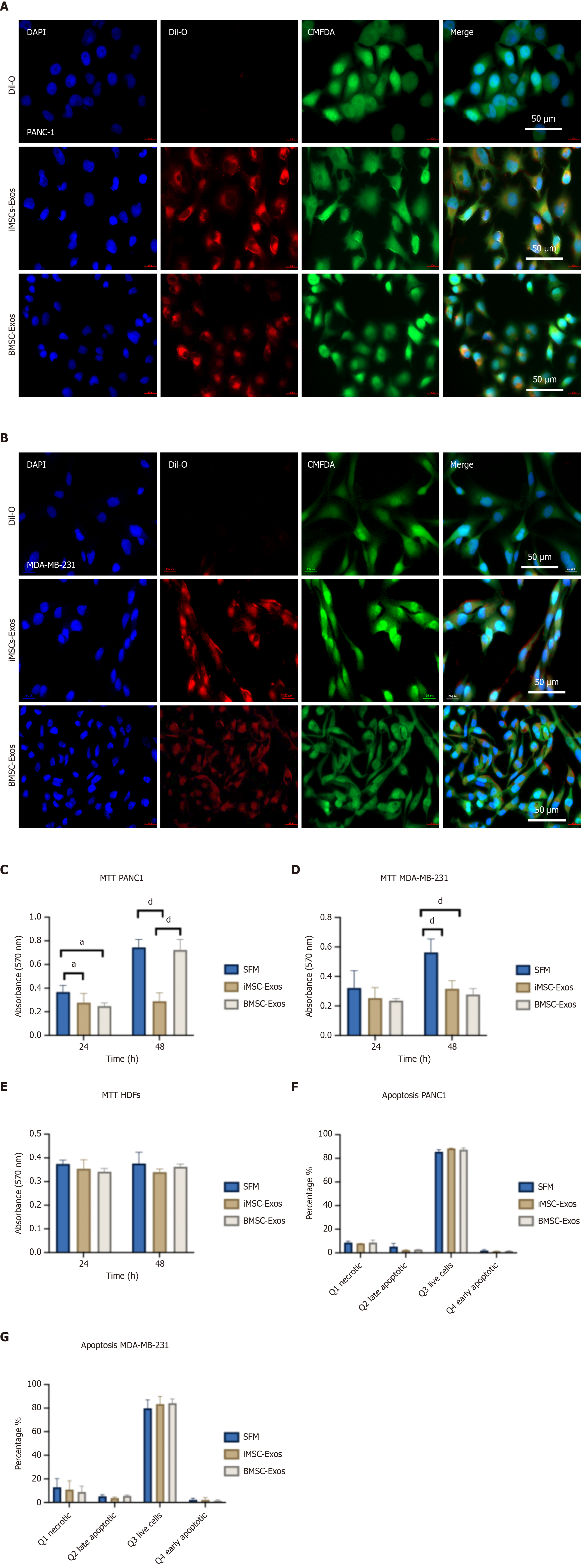 A and B: Fluorescence images showing internalization of DiI-labeled exosomes derived from induced pluripotent stem cell-derived mesenchymal stem cells and bone marrow mesenchymal stem cells by PANC1 (A) and MDA-MB-231 (B) cells after 12 hours of incubation. Red fluorescence indicates exosomes, scale bar = 50 μm; C-E: MTT assay results showing cell viability in PANC1 (C), MDA-MB-231 (D), and human dermal fibroblasts (E) following 24 hours and 48 hours of treatment with 50 μg/mL exosomes derived from induced pluripotent stem cell-derived mesenchymal stem cells or bone marrow mesenchymal stem cells; F and G: Flow cytometric analysis of apoptosis in PANC1 (F) and MDA-MB-231 (G) after 48-hour exposure to exosomes, using Annexin V-FITC/PI staining. Quadrants represent: Q1 = necrotic; Q2 = late apoptotic; Q3 = viable; and Q4 = early apoptotic cells. Data are presented as mean ± SD. aP ≤ 0.05, dP ≤ 0.0001. iMSC-Exos: Exosomes derived from induced pluripotent stem cell-derived mesenchymal stem cells; BMSC-Exos: Exosomes derived from bone marrow mesenchymal stem cell; SFM: Serum-free medium; HDF: Human dermal fibroblasts.