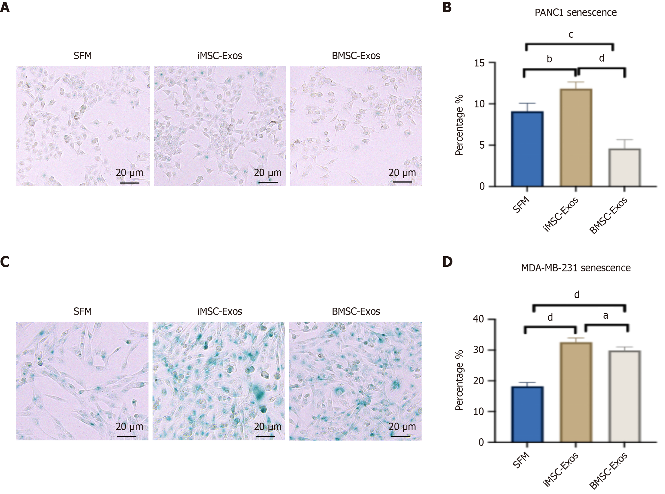 A: Representative images of senescence-associated beta-galactosidase (SA-βGal)-stained PANC1 cells after 48 hours of treatment. Blue staining marks SA-βGal-positive senescent cells (scale bar = 20 μm); B: Quantification of SA-βGal-positive cells expressed as a percentage of the total cell population in PANC1 cultures; C: Representative images of SA-βGal-stained MDA-MB-231 cells after 48 hours of treatment. Blue staining marks SA-βGal-positive senescent cells (scale bar = 20 μm); D: Quantification of SA-βGal-positive cells expressed as a percentage of the total cell population in MDA-MB-231 cultures. Values represent mean ± SD. aP ≤ 0.05, bP ≤ 0.01, cP ≤ 0.001, dP ≤ 0.0001. iMSC-Exos: Exosomes derived from induced pluripotent stem cell-derived mesenchymal stem cells; BMSC-Exos: Exosomes derived from bone marrow mesenchymal stem cell; SFM: Serum-free medium.