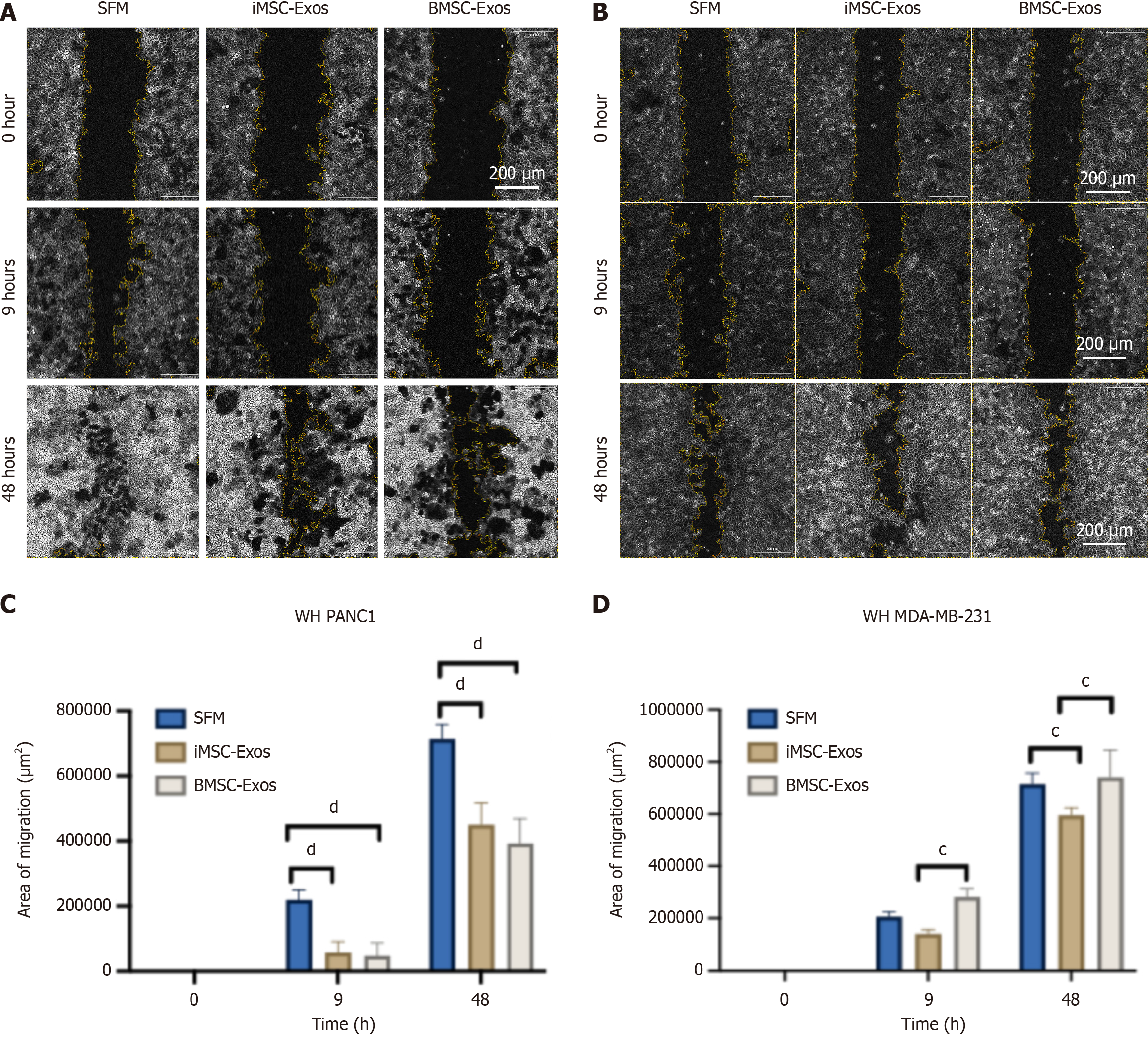 A and B: Representative images from the scratch assay illustrating wound closure in PANC1 (A) and MDA-MB-231 (B) cells treated with induced pluripotent stem cell-derived mesenchymal stem cell-derived exosomes or bone marrow mesenchymal stem cell-derived exosomes (scale bar = 200 μm); C and D: Quantitative analysis of wound area closure was conducted at 0 hour, 9 hours, and 48 hours post-scratch for PANC1 (C) and MDA-MB-231 (D) cells. Results are presented as mean ± SD. cP ≤ 0.001, dP ≤ 0.0001. iMSC-Exos: Exosomes derived from induced pluripotent stem cell-derived mesenchymal stem cells; BMSC-Exos: Exosomes derived from bone marrow mesenchymal stem cell; SFM: Serum-free medium.