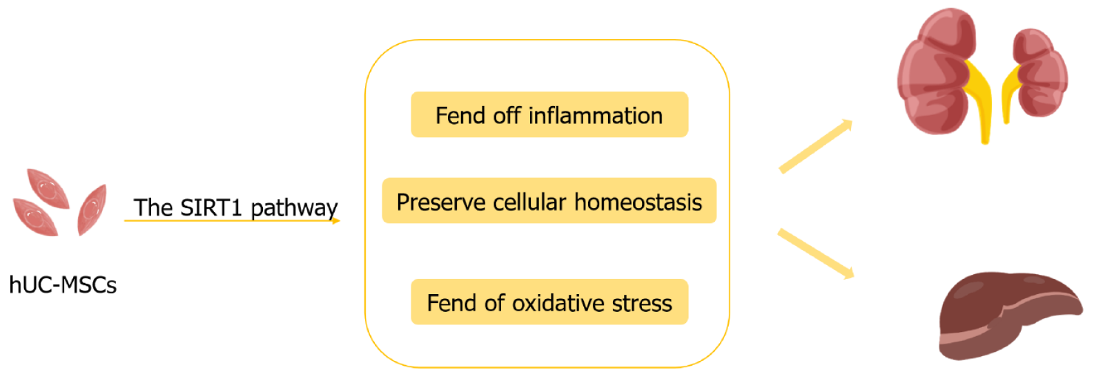 Figure 1 Mechanism of human umbilical cord mesenchymal stem cells action via the sirtuin 1 pathway common to kidney and liver.
