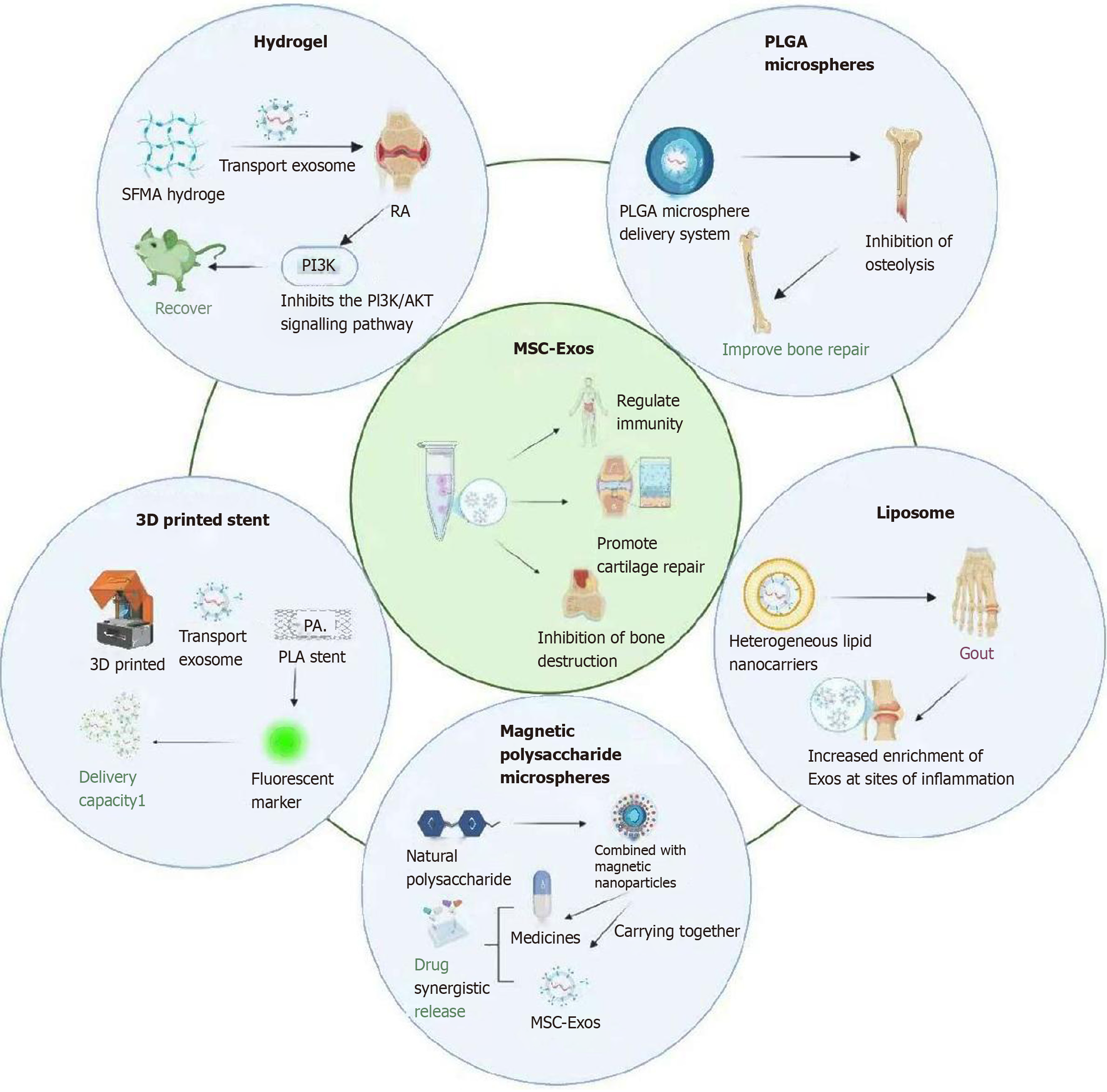 SFMA: Silk fibroin glycidyl methacrylate; RA: Rheumatoid arthritis; PI3K: Phosphatidylinositol 3-kinase; AKT: Protein kinase B; PLGA: Poly(lactic-co-glycolic acid); MSC-Exos: Mesenchymal stem cell-derived exosomes; 3D: Three-dimensional; PA: Phosphatidic acid; PLA: Polylactic acid.