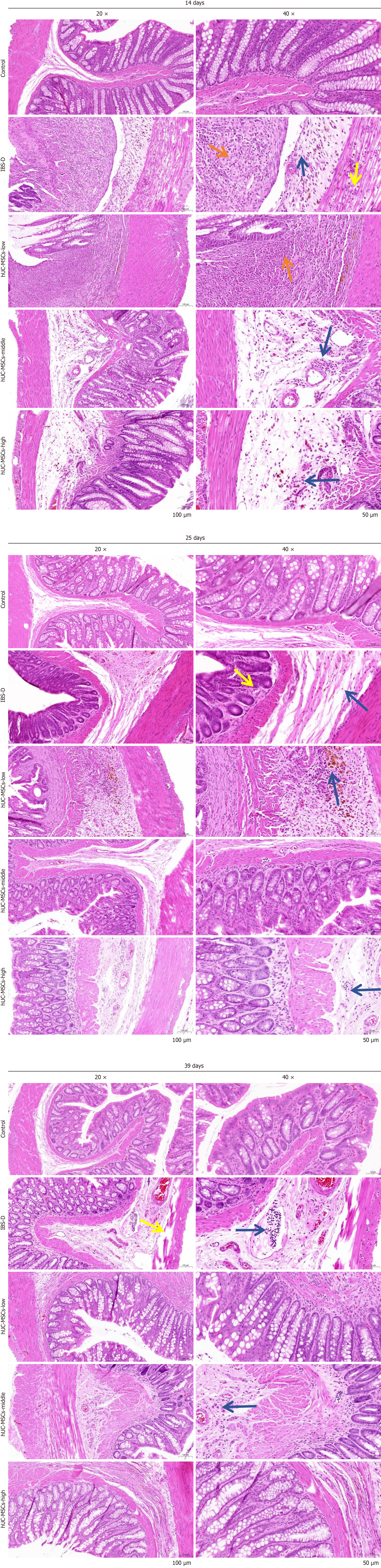 Morphology and structure of colon tissue of different groups on days 14, 25, and 39. Orange arrows indicate inflammatory cell infiltration; blue arrows indicate that the ulcer has invaded the submucosa and been replaced by proliferating the connective tissue; yellow arrows indicate loose edema of the inner annular muscle and the outer longitudinal muscle. hUC-MSCs: Human umbilical cord mesenchymal stem cells; IBS-D: Diarrheal irritable bowel syndrome.
