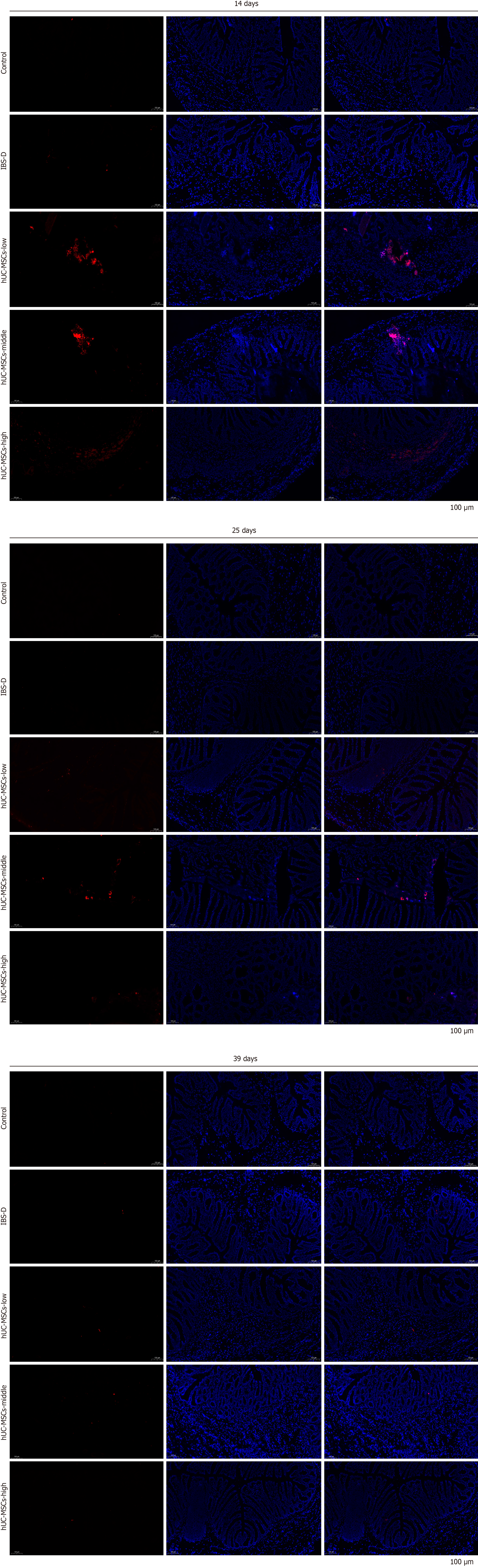 Distribution of human umbilical cord mesenchymal stem cells (hUC-MSCs) in the colon tissue of different groups on days 14, 25, and 39. IBS-D: Diarrheal irritable bowel syndrome.