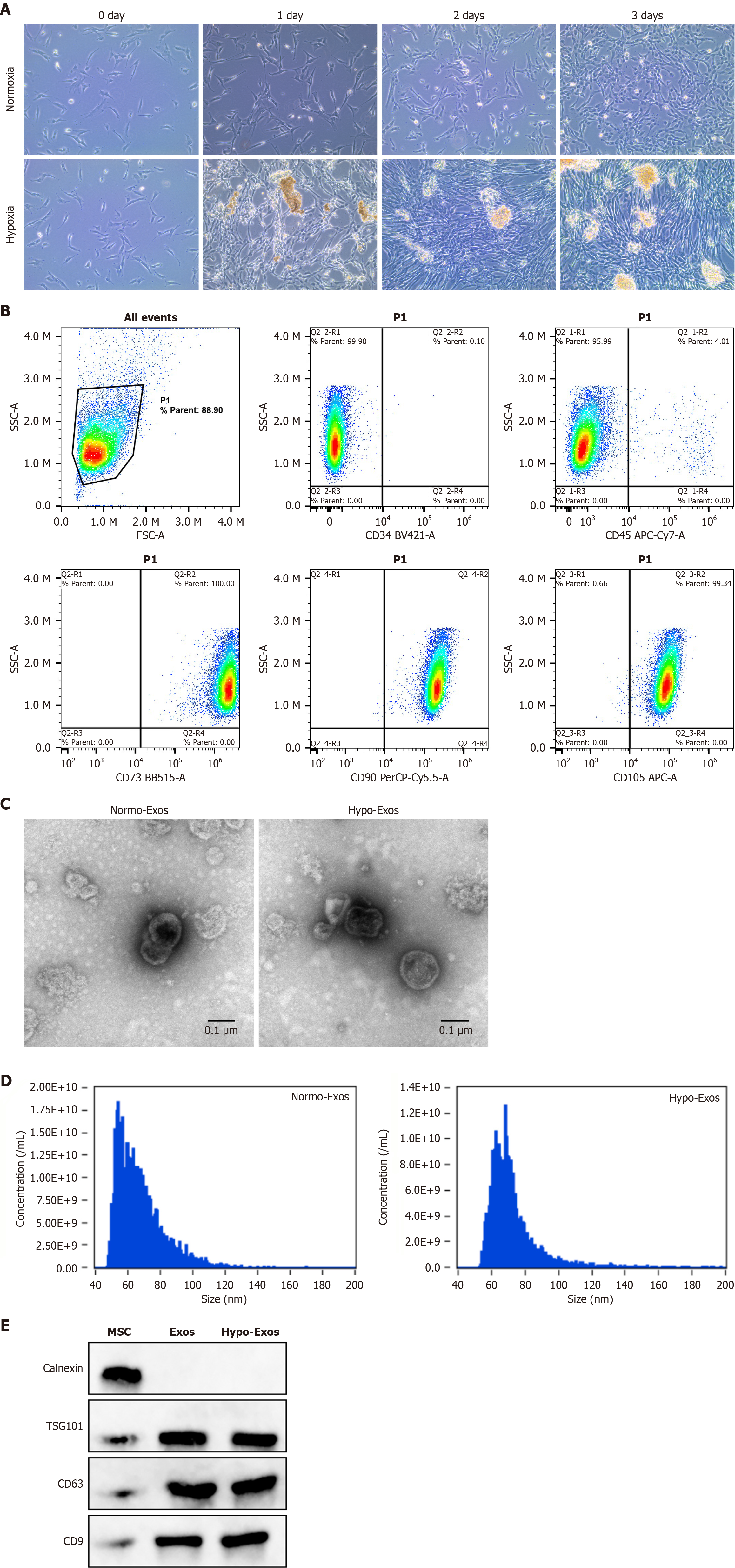 A: Representative bright-field microscopy image of human umbilical cord-derived mesenchymal stem cells (HUC-MSCs); B: HUC-MSCs identification by flow cytometry phenotyping; C: Representative electron microscopy image of HUC-MSC-derived exosomes; D: Size distribution of exosomes (Exos) determined by nanoparticle tracking analysis; E: Western blot analysis of the surface markers of HUC-MSCs and exosomes. Hypo-Exos: Hypoxia-preconditioned mesenchymal stem cell-derived exosomes; Normo-Exos: Normoxic exosomes; TSG101: Tumor susceptibility gene 101.
