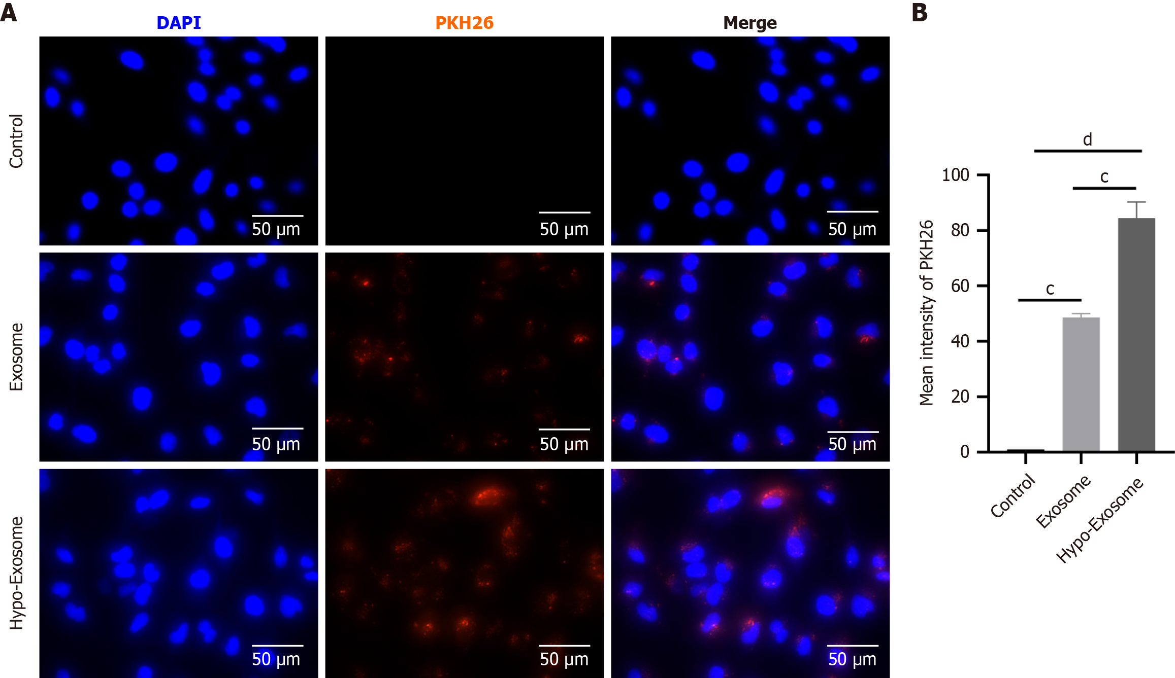 A: Uptake of the red fluorescence dye PKH26-labeled normoxic exosomes and hypoxia-preconditioned mesenchymal stem cell-derived exosomes (Hypo-Exosome) into H9C2 cells; B: Statistical evaluation of fluorescence intensities. Data are presented as the mean ± standard error of the man (n = 3). cP < 0.001, dP < 0.0001.
