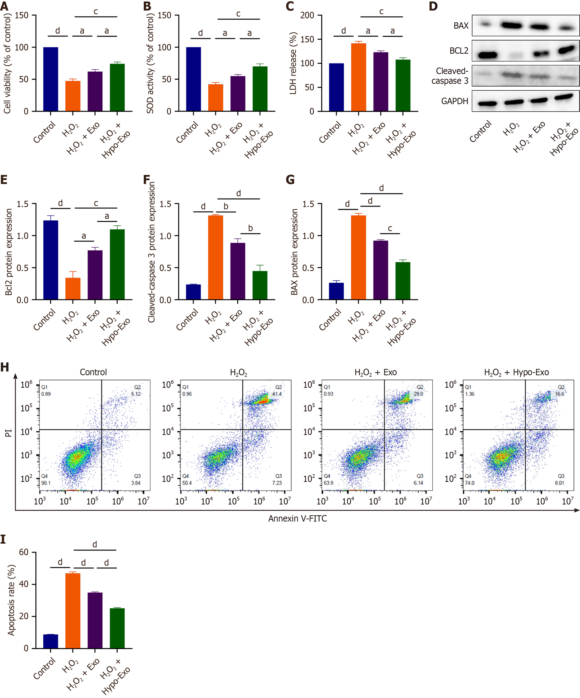 A: Different effects of normoxic counterparts (normo-Exos) and hypoxia-preconditioned mesenchymal stem cell-derived exosomes (hypo-Exos) on the viability of H9C2 cells; B: Different effects of normo-Exos and hypo-Exos on superoxide dismutase (SOD) activity in hydrogen peroxide (H2O2)-induced H9C2 cells; C: Different effects of normo-Exos and hypo-Exos on lactate dehydrogenase (LDH) release in H2O2-induced H9C2 cells; D: Expression of apoptosis-related protein was determined by western blotting; E-G: Quantitative analysis of the western blotting; H: Level of apoptosis was determined by flow cytometry; I: Statistical evaluation of flow cytometry. Data are presented as the mean ± standard error of the mean (n = 3). aP < 0.05, bP < 0.01, cP < 0.001, dP < 0.0001.