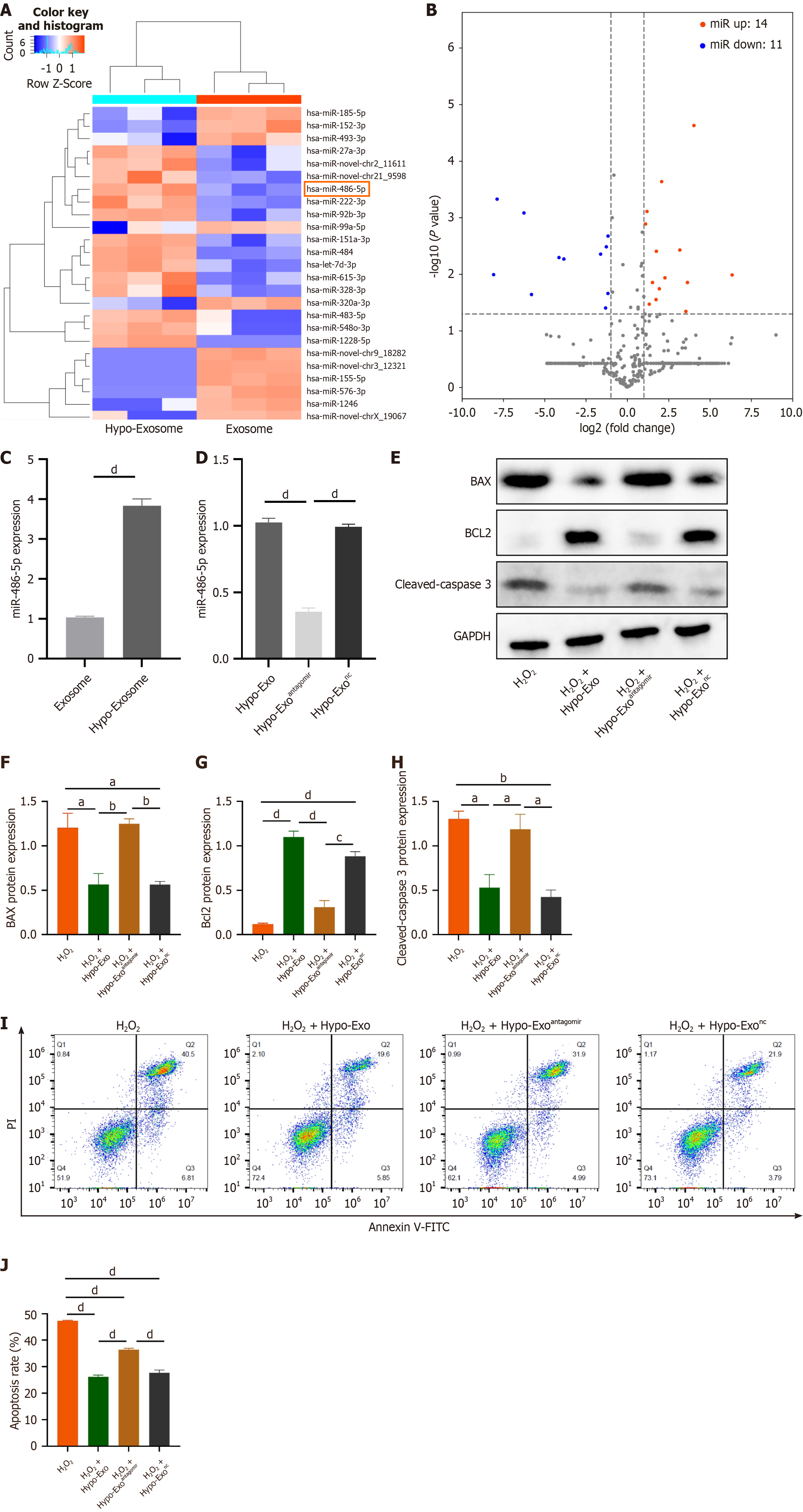 A: Heat map based on high-throughput microRNAs sequencing representing the 25 identified microRNAs with the most significant abundance differences between normoxic counterparts (normo-Exos) and hypoxia-preconditioned mesenchymal stem cell-derived exosomes (hypo-Exos); B: Volcano plot showing log2 (fold change) on the X-axis and -log10 (P value) on the Y-axis; C: MiR-486-5p expression level in normo-Exos and hypo-Exos determined by quantitative polymerase chain reaction; D: MiR-486-5p antagomir or negative control transfected into hypo-Exos altered the miR-486-5p expression level in hypo-Exos; E: Expression of apoptosis-related protein was determined by western blotting; F-H: Quantitative analysis of the western blotting; I: Level of apoptosis was determined by flow cytometry; J: Statistical evaluation of flow cytometry. All data are representative of three independent experiments and are presented as the mean ± standard error of the mean (n = 3). aP < 0.05, bP < 0.01, cP < 0.001, dP < 0.0001.