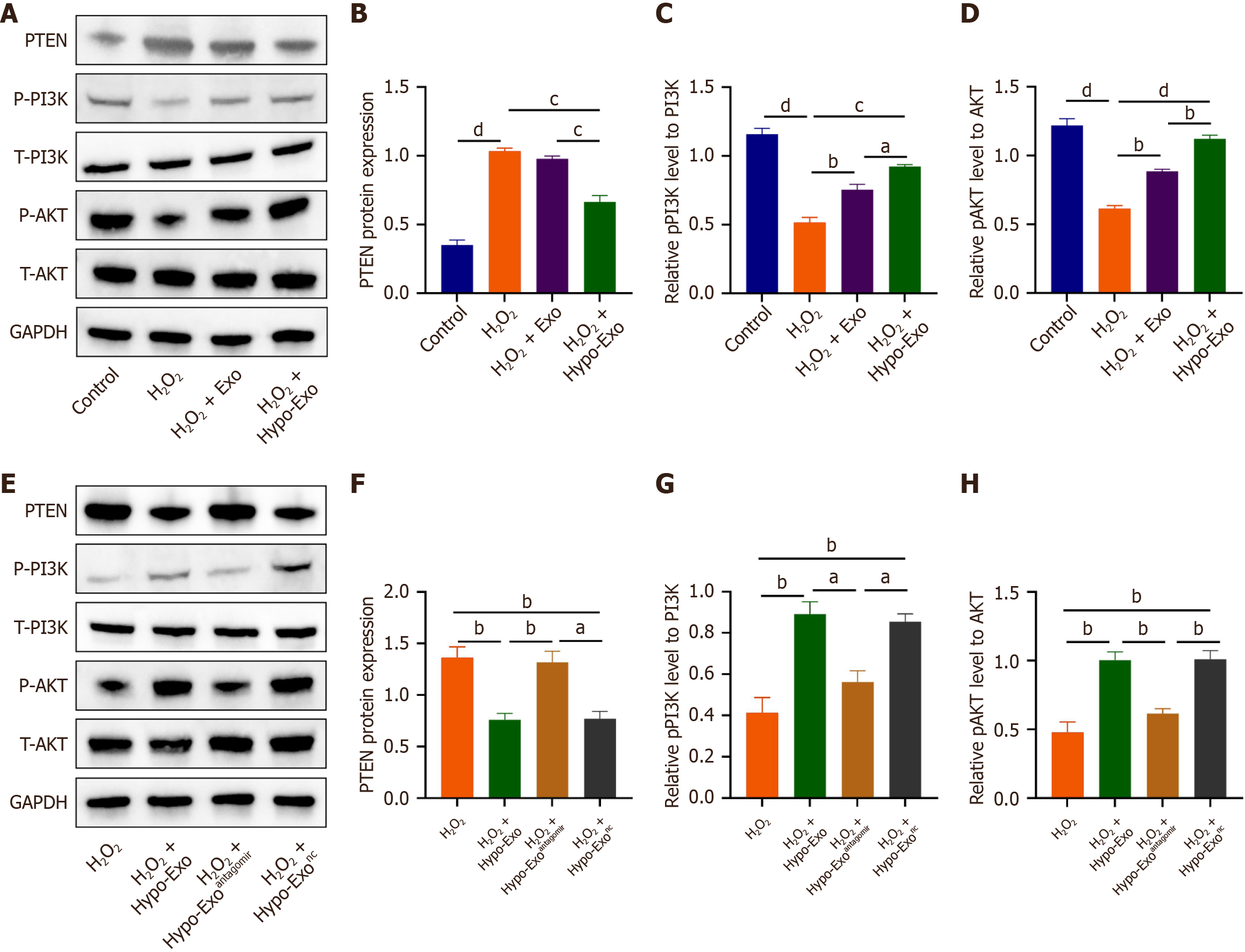 A-H: Expression of phosphatase and tensin homolog (PTEN) and phosphoinositide 3-kinase (PI3K)/protein kinase B (Akt) signaling pathway protein was determined by western blotting (A and E). Quantitative analysis of the western blotting. All data are representative of three independent experiments and are presented as the mean ± standard error of the mean (n = 3). aP < 0.05, bP < 0.01, cP < 0.001, dP < 0.0001.