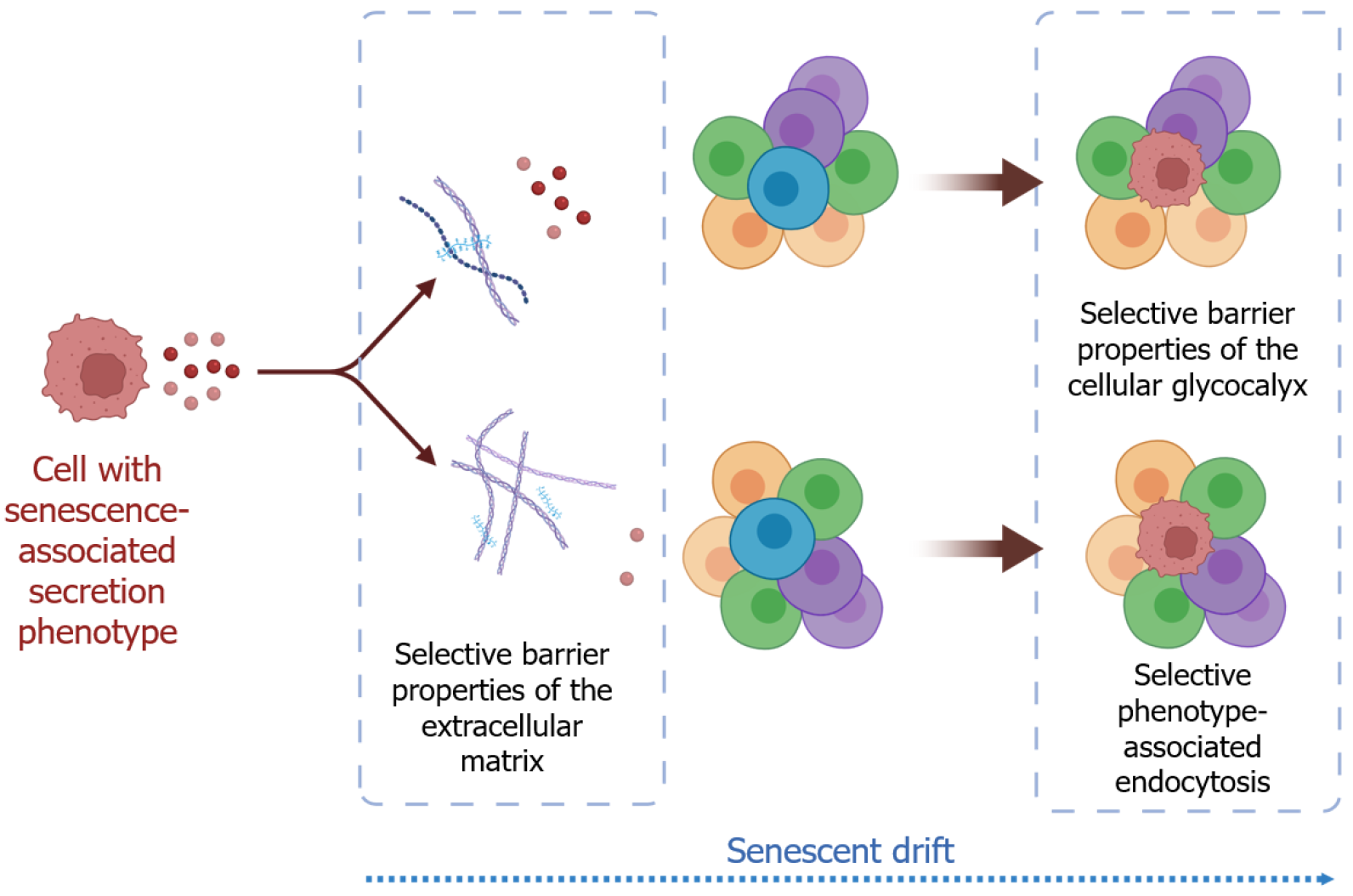 Figure 1 Explanation of the differences between the senescence-associated secretion phenotype and senescent drift, and the extra cellular matrix/glycocalyx-dependent transfer of the extracellular vesicles.