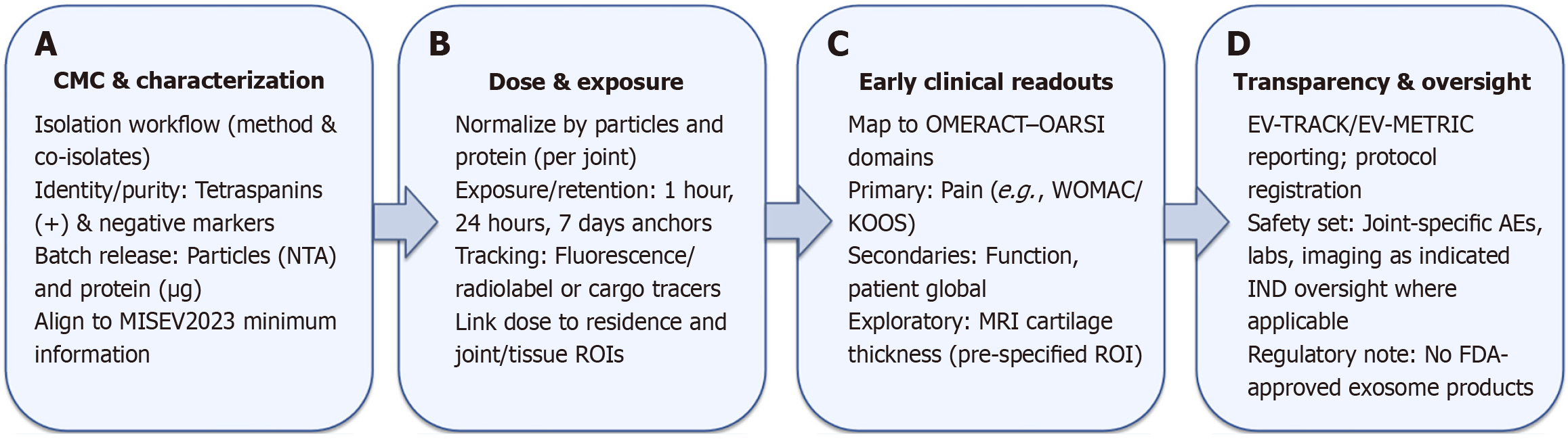 A: Chemistry, manufacturing, and controls & characterization: Isolation workflow → identity/purity panels (tetraspanins/negative markers) → batch release (particles, μg) per Minimal Information for Studies of Extracellular Vesicles 2023; B: Dose & exposure: Normalized dose (particles and protein) and harmonized exposure/retention time-points (e.g., 1 hour, 24 hours, 7 days); C: Early clinical readouts: Endpoints mapped to the Outcome Measures in Rheumatology-Osteoarthritis Research Society International core domain set, with magnetic resonance imaging cartilage thickness as an exploratory structural biomarker informed by the Foundation for the National Institutes of Health Osteoarthritis Biomarkers Consortium; D: Transparency & oversight: Transparent Reporting and Centralizing Knowledge in Extracellular Vesicle Research/EV-METRIC badge and regulatory caution that no exosome products are United States Food and Drug Administration-approved; safety monitoring loop aligned with Investigational New Drug processes. CMC: Chemistry, manufacturing, and controls; NTA: Nanoparticle tracking analysis; MISEV2023: Minimal Information for Studies of Extracellular Vesicles (2023 update); ROI: Region of interest; OMERACT: Outcome Measures in Rheumatology; OARSI: Osteoarthritis Research Society International; WOMAC: Western Ontario and McMaster Universities Osteoarthritis Index; KOOS: Knee injury and Osteoarthritis Outcome Score; MRI: Magnetic resonance imaging; EV-TRACK: Transparent Reporting and Centralizing Knowledge in Extracellular Vesicle Research; EV-METRIC: Transparent Reporting and Centralizing Knowledge in Extracellular Vesicle Research Reporting Completeness Score; AEs: Adverse events; IND: Investigational New Drug; FDA: Food and Drug Administration.