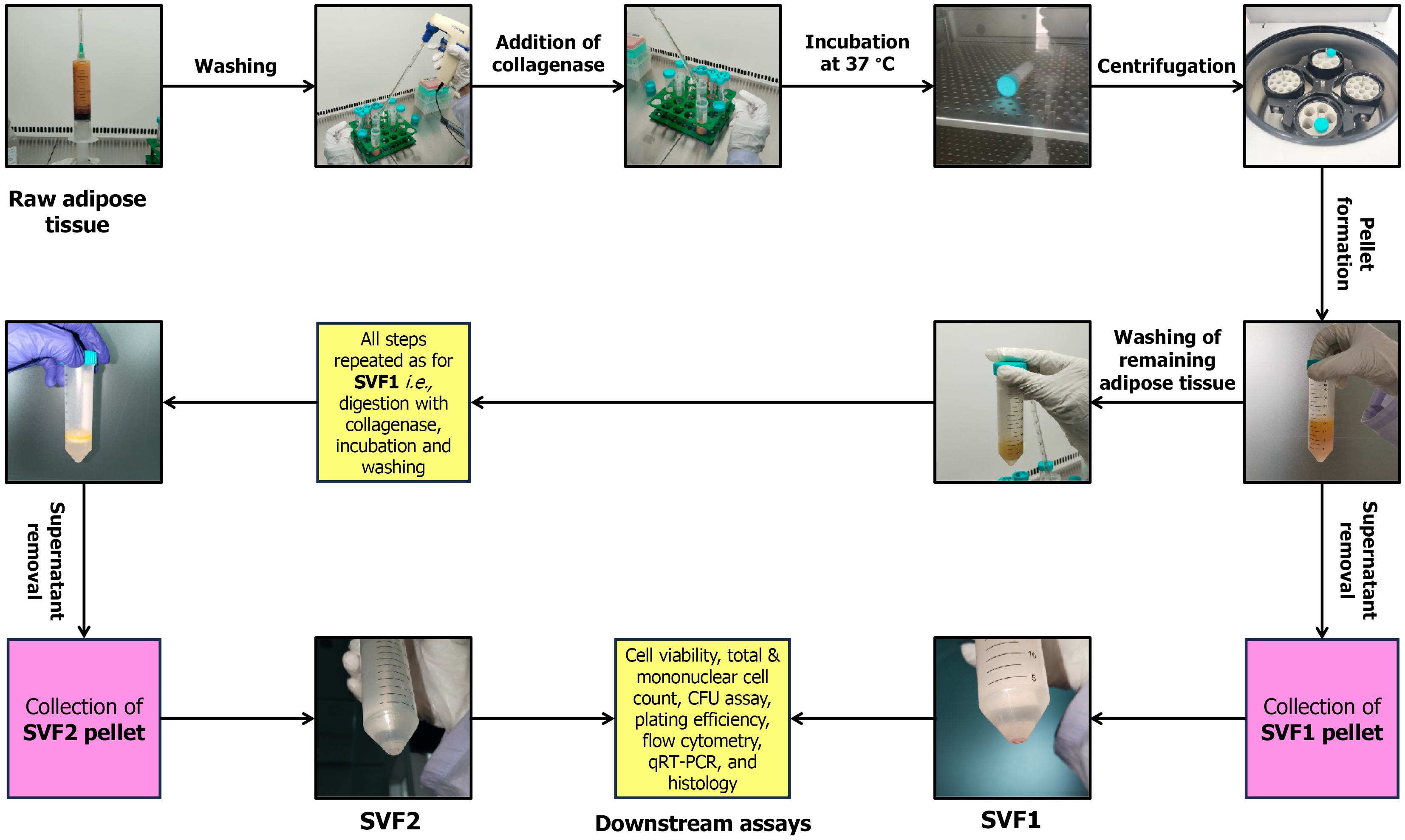 The first digestion yields stromal vascular fraction 1, and the residual tissue undergoes a second digestion to obtain stromal vascular fraction 2. Both fractions were collected after centrifugation and used for downstream assays such as viability testing, flow cytometry, and gene expression analysis. SVF: Stromal vascular fraction; CFU: Colony forming unit; qRT-PCR: Quantitative reverse transcription polymerase chain reaction.