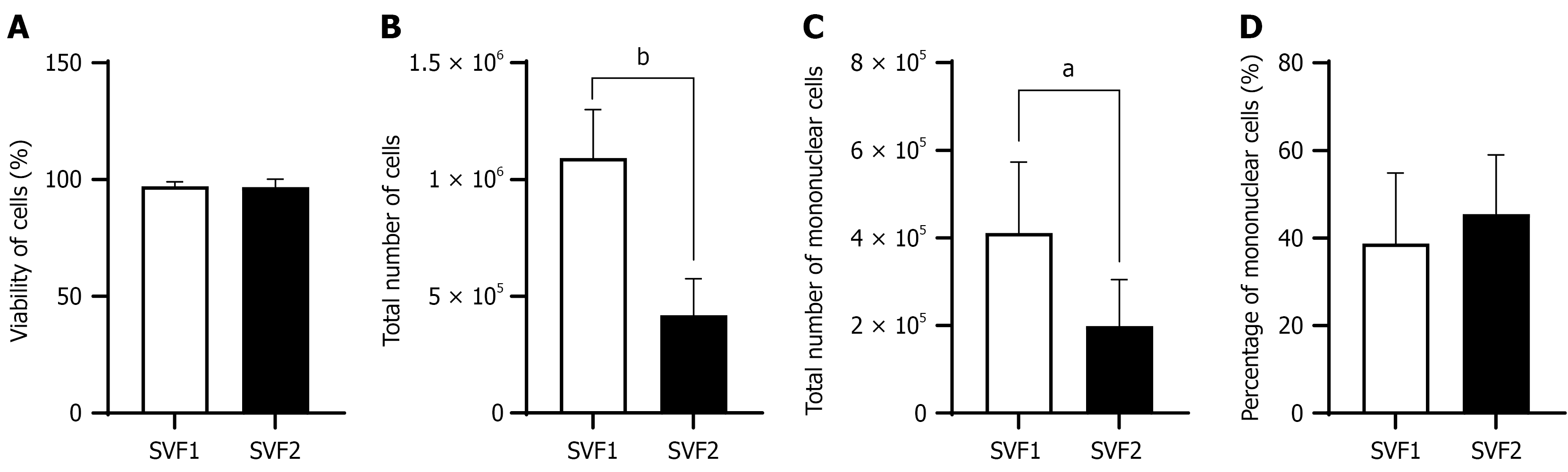 A-D: The viability of cells (A), total number of cells (B), total number of mononucleated cells (C) and percentage of mononucleated cells (D) in stromal vascular fraction 1 and stromal vascular fraction 2. Results have been presented as mean ± SD and statistical significance was measured between stromal vascular fraction 1 and stromal vascular fraction 2 by unpaired two-tailed Student’s t-test. aP < 0.05; bP < 0.001. SVF: Stromal vascular fraction.