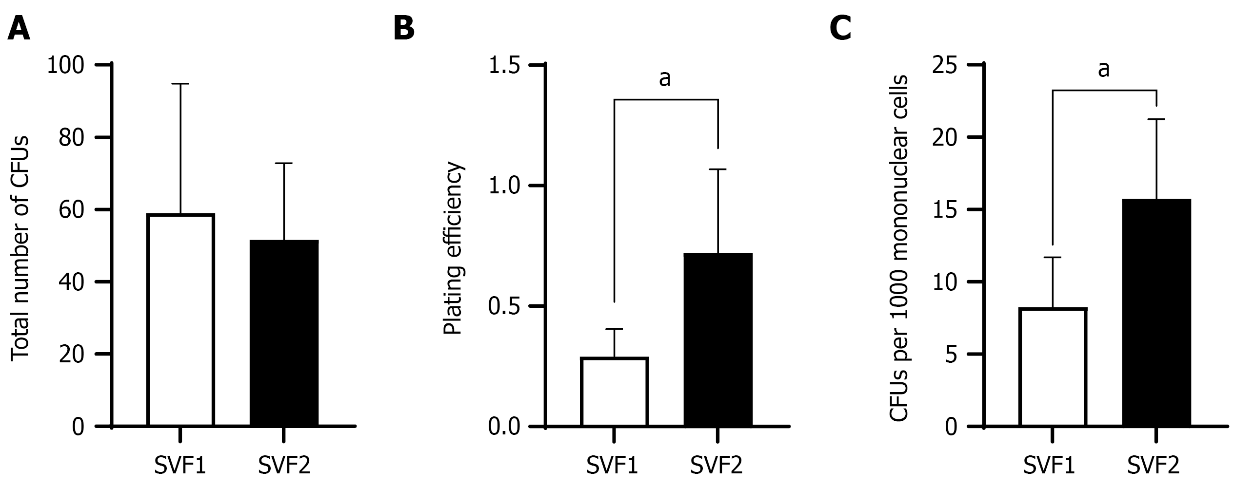 A-C: Figure shows total number of colony forming units (CFU) (A), plating efficiency (B), and number of CFUs per 1000 mononucleated cells (C) in stromal vascular fraction 1 and stromal vascular fraction 2. Graphs were presented as mean ± SD and statistical significance was measured between stromal vascular fraction 1 and stromal vascular fraction 2 by unpaired two-tailed Student’s t-test. aP < 0.05. SVF: Stromal vascular fraction; CFU: Colony forming unit.