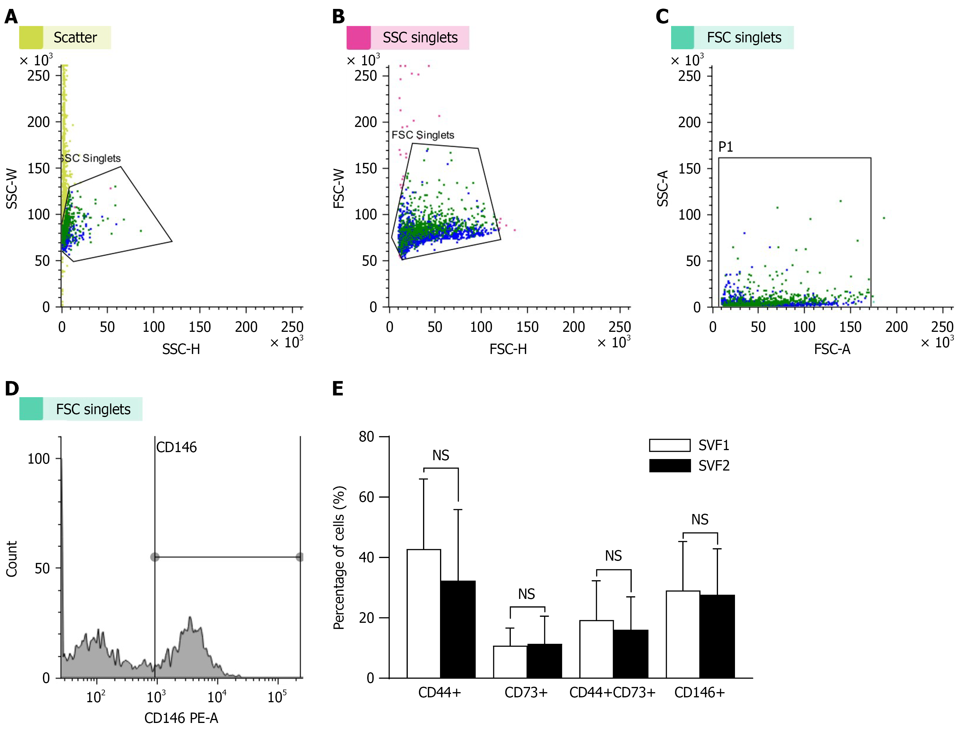 A-C: Representative flow cytometry plots showing the expression of regenerative surface markers in stromal vascular fractions (SVF). Dot plots and histograms represent gating and marker expression profiles for CD44, CD73, and CD146 in SVF1 and SVF2; D and E: Bar graph comparing the percentage of CD44+, CD73+, CD44+CD73+ (double-positive), and CD146+ cells in SVF1 and SVF2. SVF: Stromal vascular fraction.