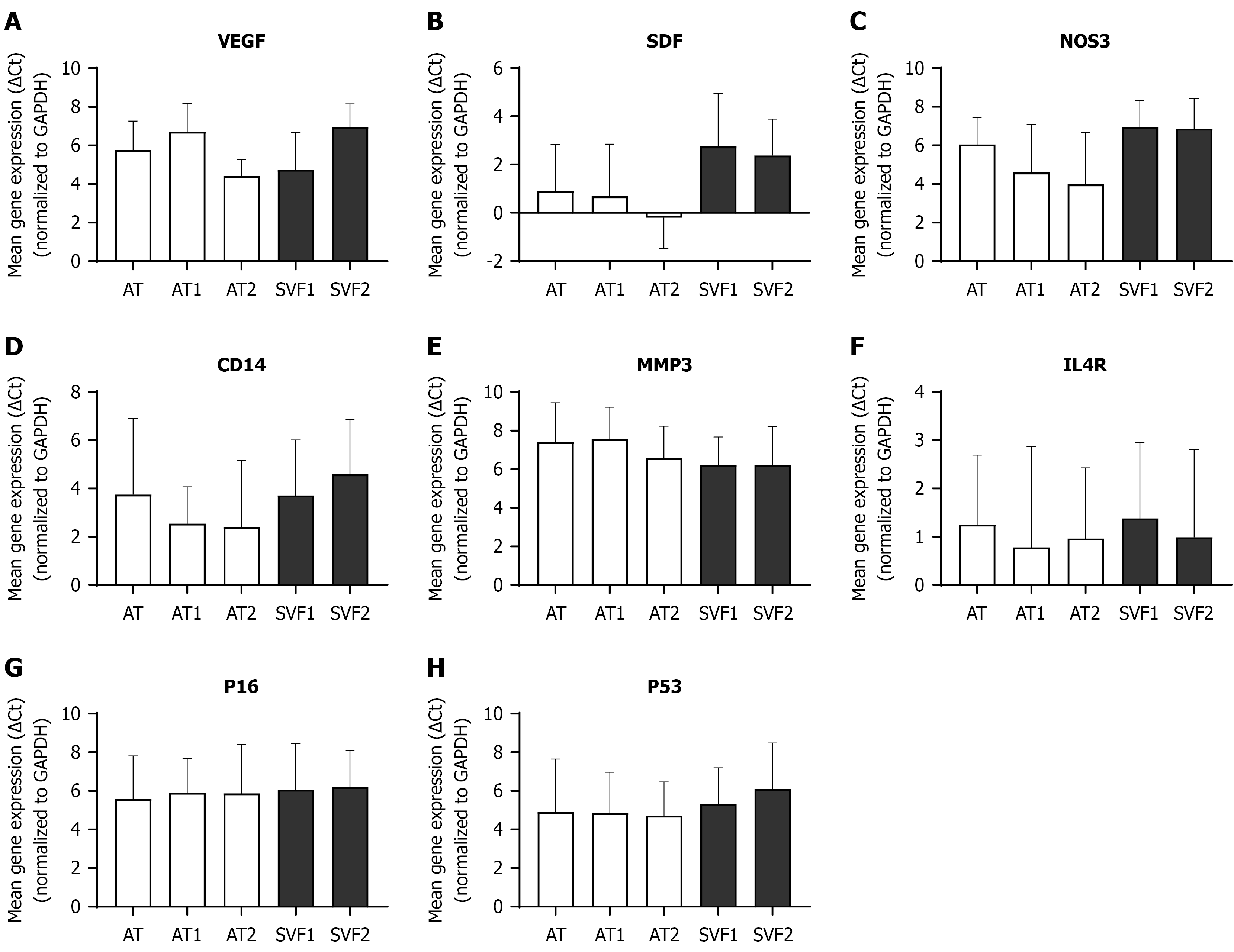 Mean gene expression of target genes normalized to GAPDH in adipose tissue (AT), AT1, AT2, stromal vascular fraction 1, stromal vascular fraction 2. A-H: Mean gene expression of vascular endothelial growth factor (A), stromal cell-derived factor (B), nitric oxide synthase-3 (C), CD14 (D), matrix metalloproteinase 3 (E), interleukin-4 receptor (F), P16 (G), and P53 (H). Differences between all fractions that are shown in the graphs of all genes are not significant statistically as P > 0.05. VEGF: Vascular endothelial growth factor; SDF: Stromal cell-derived factor; NOS3: Nitric oxide synthase-3; MMP3: Matrix metalloproteinase 3; IL4R: Interleukin-4 receptor; CDKN2A: Cyclin-dependent kinase inhibitor 2A; AT: Adipose tissue; SVF: Stromal vascular fraction.