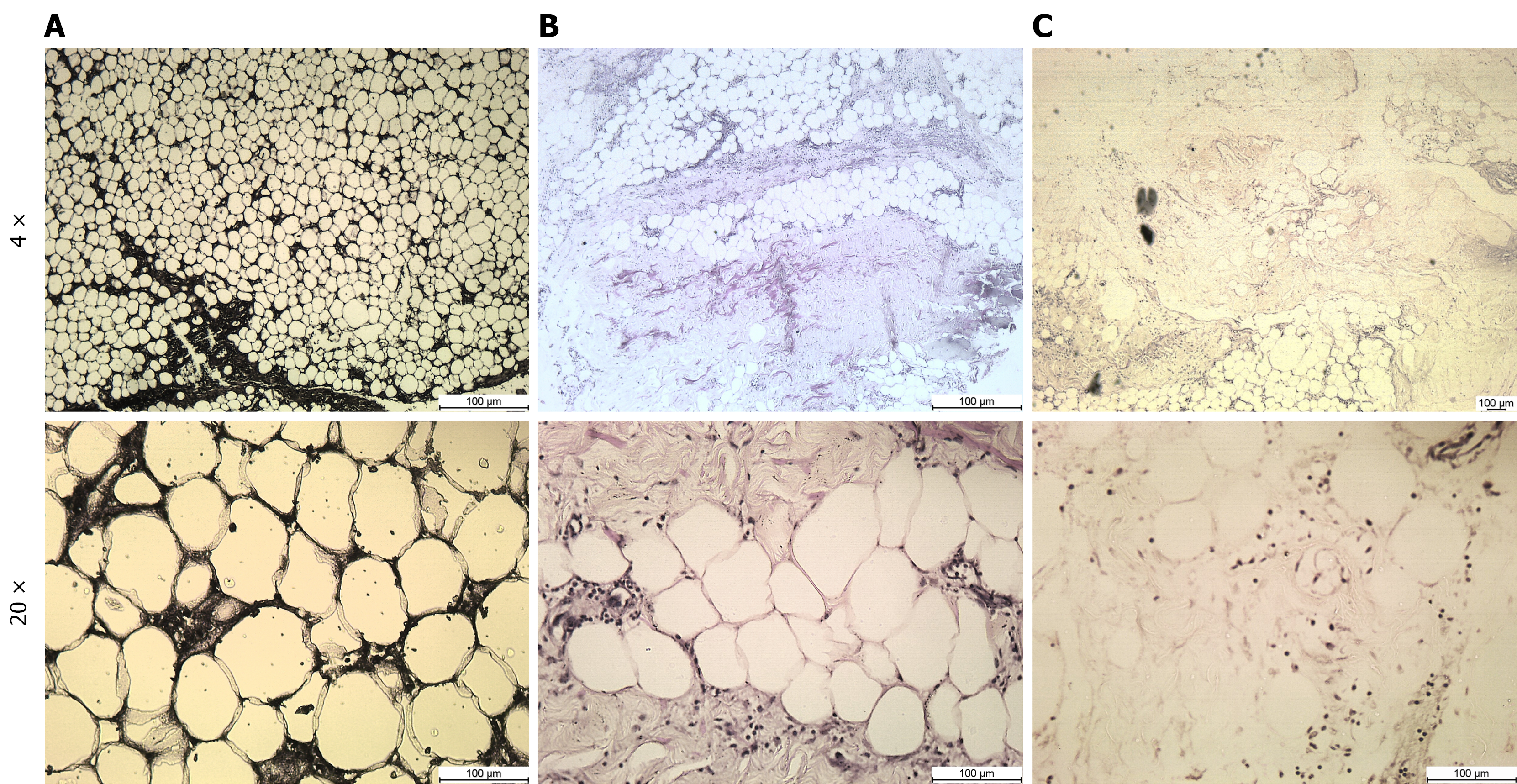 Representative photomicrographs of adipose tissue sections captured at 4 × (left) and 20 × (right) magnifications. A: Undigested adipose tissue showing a well-preserved and compact structure of densely packed, adipocytes with intact morphology and minimal extracellular matrix (ECM) disruption; B: Adipose tissue after the first round of collagenase digestion reveals partial ECM degradation and moderate adipocyte disruption, with some cells retaining morphology and others beginning to dissociate; C: Tissue after the second round of digestion demonstrates substantial structural breakdown, with complete loss of adipocyte integrity and prominent fibrous ECM remnants. This stage reflects advanced digestion and effective decellularization.