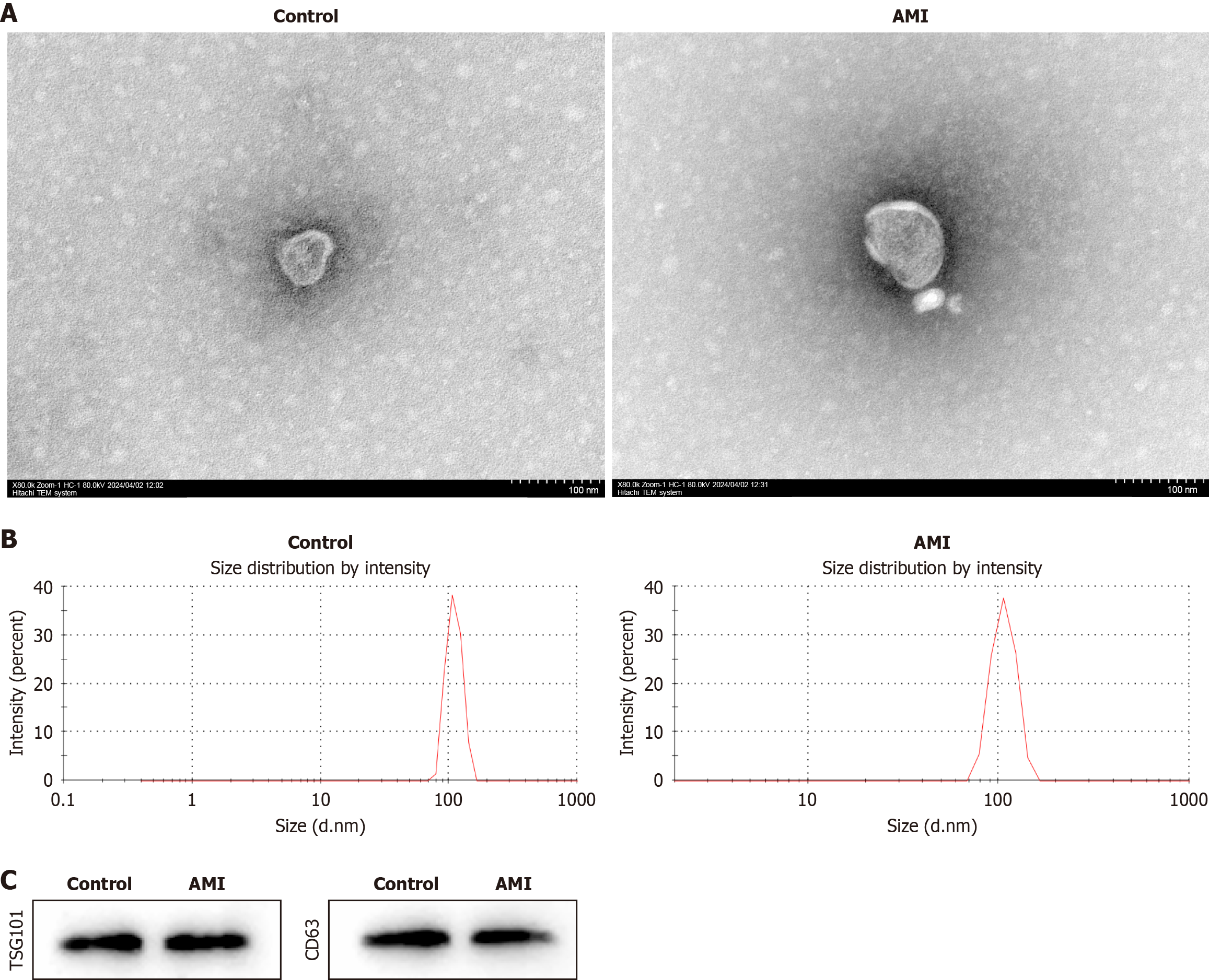 A: Transmission electron microscopy characterization of exosomes isolated from peripheral blood-derived mesenchymal stem cells of acute mesenteric ischemia patients and controls (scale bar: 100 nM); B: Nanoparticle tracking analysis characterization of exosomes isolated from peripheral blood-derived mesenchymal stem cells of acute mesenteric ischemia patients and controls; C: Expression levels of two exosome marker proteins (tumor susceptibility gene 101 and CD63) were measured by western blot. AMI: Acute mesenteric ischemia; TSG101: Tumor susceptibility gene 101.