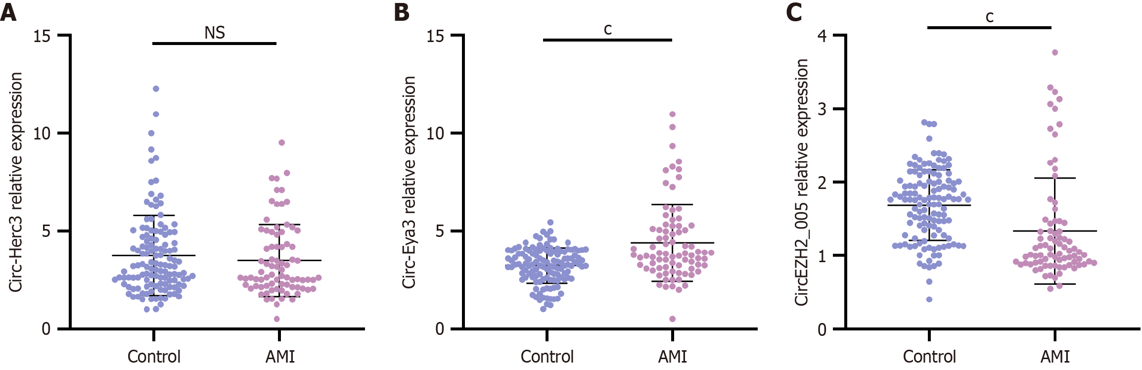 A-C: Quantitative real-time polymerase chain reaction was used to measure the circ-Herc3 (A), circ-Eya3 (B), and circEZH2_005 (C) levels in peripheral blood-derived mesenchymal stem cells exosomes of different groups. cP < 0.001. NS: No significant; AMI: Acute mesenteric ischemia.
