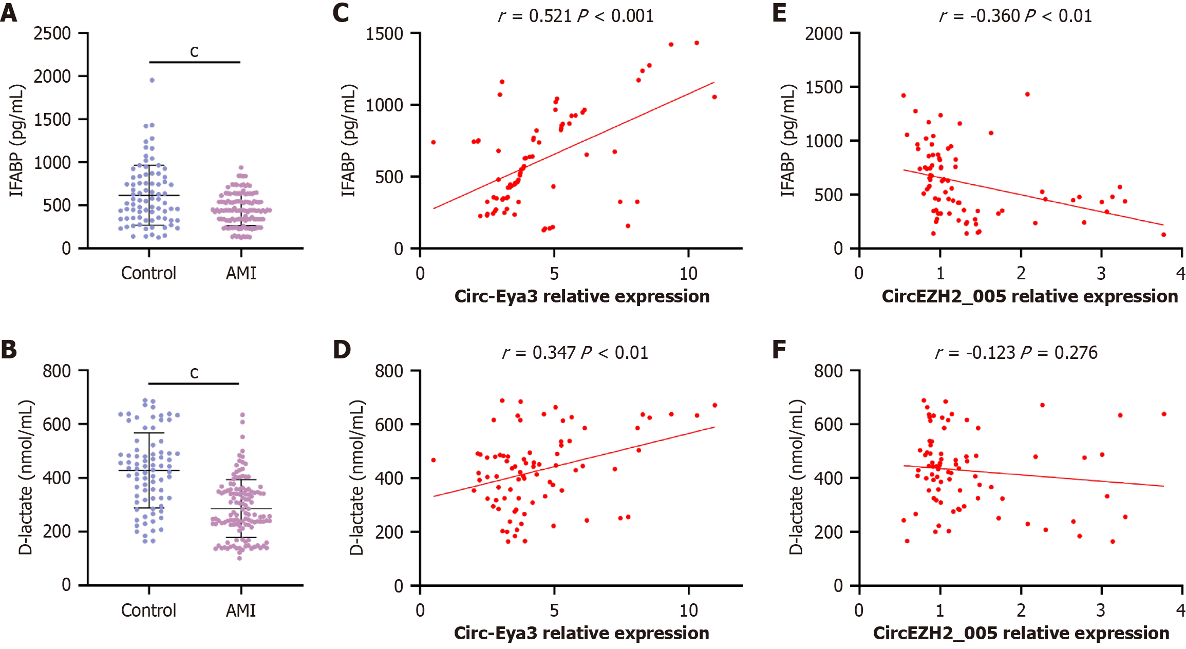 A and B: The levels of plasma intestinal fatty acid binding protein (IFABP) (A) and D-lactate (B) in acute mesenteric ischemia (AMI) patients and controls were determined by enzyme-linked immunosorbent assay; C and D: Correlations between the levels of peripheral blood-derived mesenchymal stem cells exosomal circ-Eya3 with plasma IFABP (C) and D-lactate (D) in AMI patients; E and F: Correlations between the levels of peripheral blood-derived mesenchymal stem cells exosomal circEZH2_005 with plasma IFABP (E) and D-lactate (F) in AMI patients. cP < 0.001. IFABP: Intestinal fatty acid binding protein; AMI: Acute mesenteric ischemia.