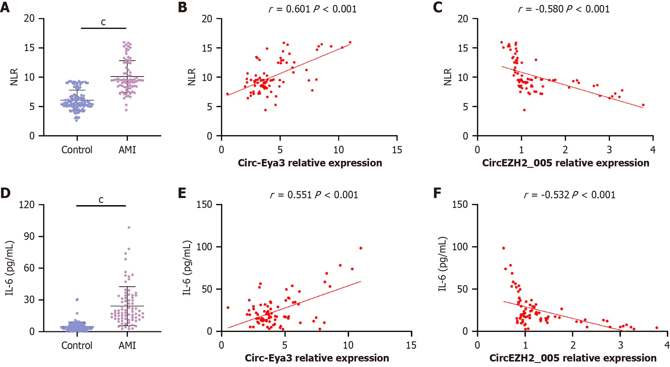 A: The levels of neutrophil-to-lymphocyte ratio in acute mesenteric ischemia (AMI) patients and controls were calculated by the ratio of neutrophils count/Lymphocytes count; B and C: Correlations between the levels of neutrophil-to-lymphocyte ratio with peripheral blood-derived mesenchymal stem cells exosomal circ-Eya3 (B) or circEZH2_005 (C) in AMI patients; D: The levels of interleukin-6 in AMI patients and controls were determined by enzyme-linked immunosorbent assay; E and F: Correlations between the levels of interleukin-6 with peripheral blood-derived mesenchymal stem cells exosomal circ-Eya3 (E) or circEZH2_005 (F) in AMI patients. cP < 0.001. NLR: Neutrophil-to-lymphocyte ratio; AMI: Acute mesenteric ischemia; IL: Interleukin.