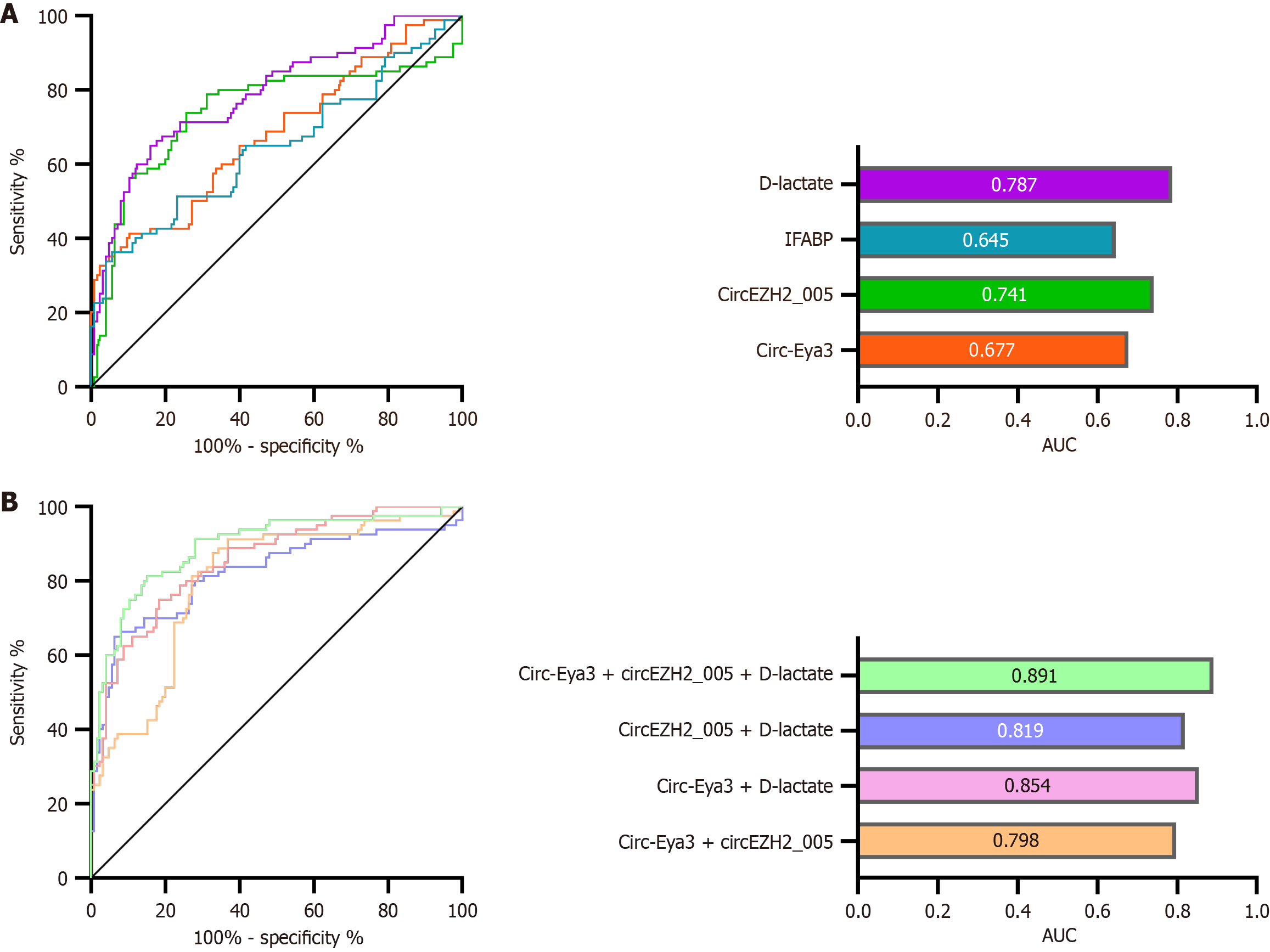 A: Separate receiver operating characteristic of circ-Eya3, circEZH2_005, intestinal fatty acid binding protein, and D-lactate; B: Combined receiver operating characteristic of circ-Eya3, circEZH2_005 and D-lactate. AUC: Area under the curve.