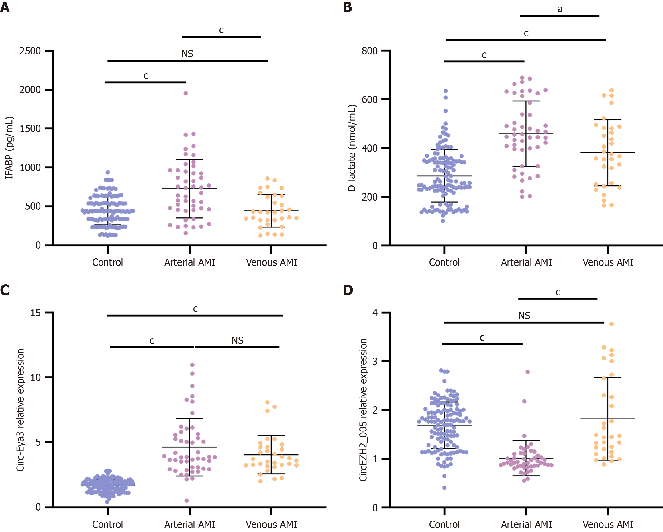 Figure 6 The differential levels of circ-Eya3, circEZH2_005, intestinal fatty acid binding protein and D-lactate in arterial vs venous acute mesenteric ischemia subtypes.