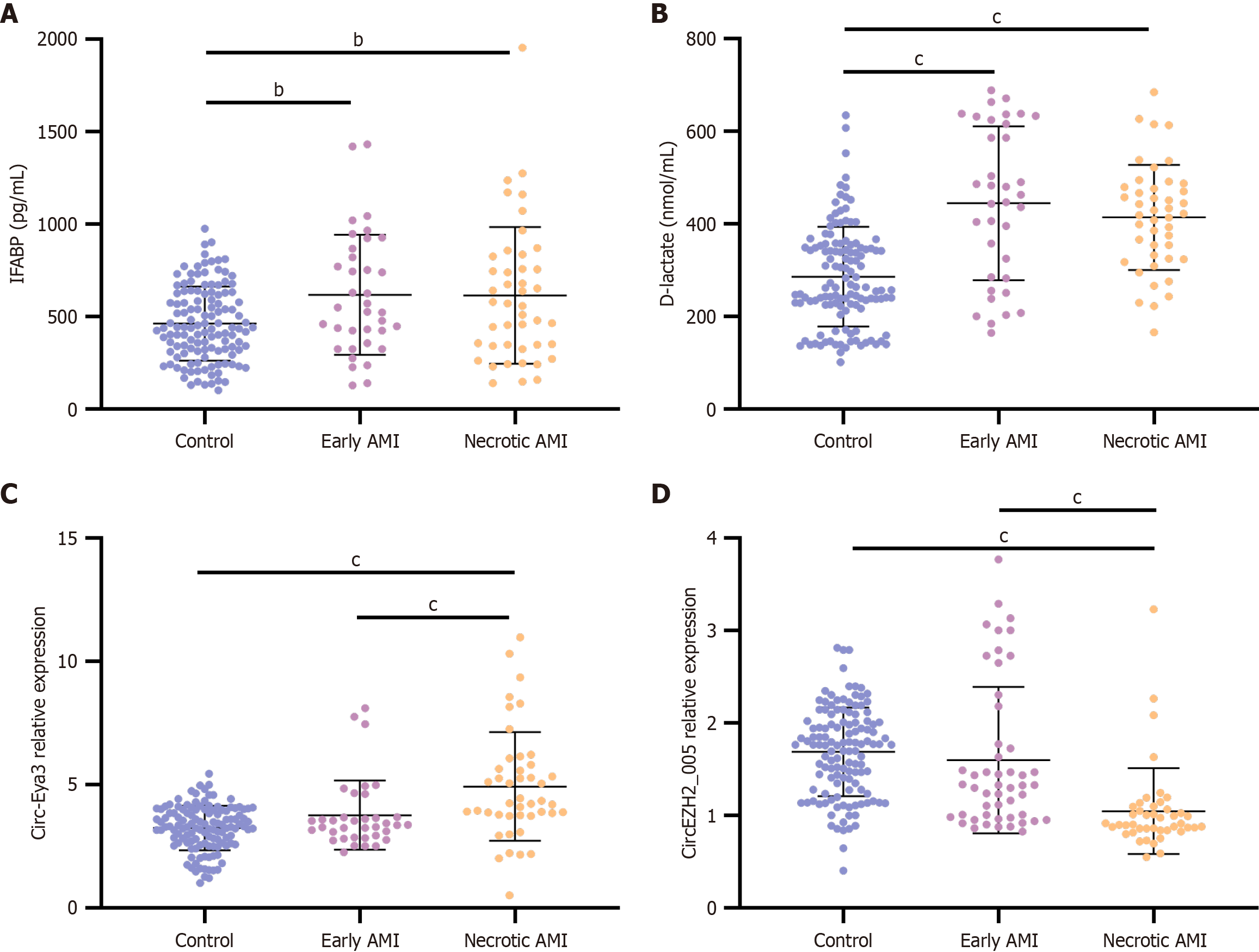 Figure 7 The differential levels of circ-Eya3, circEZH2_005, intestinal fatty acid binding protein and D-lactate in early vs late necrotic acute mesenteric ischemia subtypes.