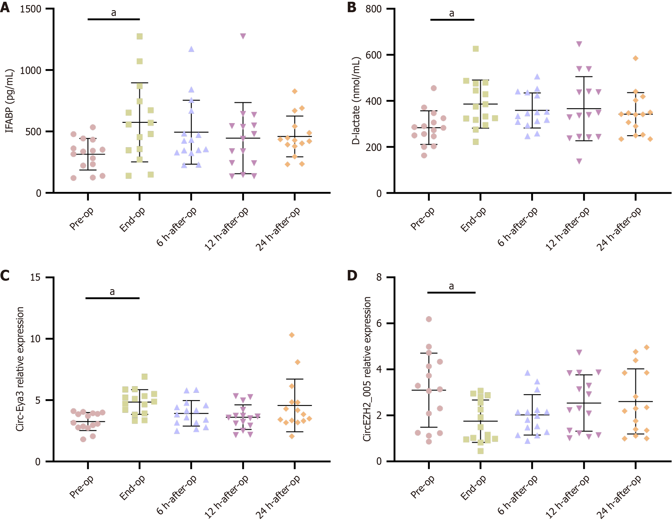 A and B: Plasma intestinal fatty acid binding protein (A) and D-lactate (B) levels in acute mesenteric ischemia patients before and after operation were detected by enzyme-linked immunosorbent assay; C and D: Circ-Eya3 (C) and circEZH2_005 (D) expression levels in acute mesenteric ischemia patients before and after operation were analyzed through quantitative real-time polymerase chain reaction. aP < 0.05. IFABP: Intestinal fatty acid binding protein.