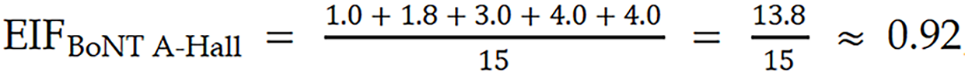 Calculating an EIF score for the BOTOX® Development Pipeline is as follows: (1) Stage classification (Table 6); (2) Quantitative inputs (Table 7); (3) EIF computational framework. The EIF can be expressed as a normalized, weighted sum: