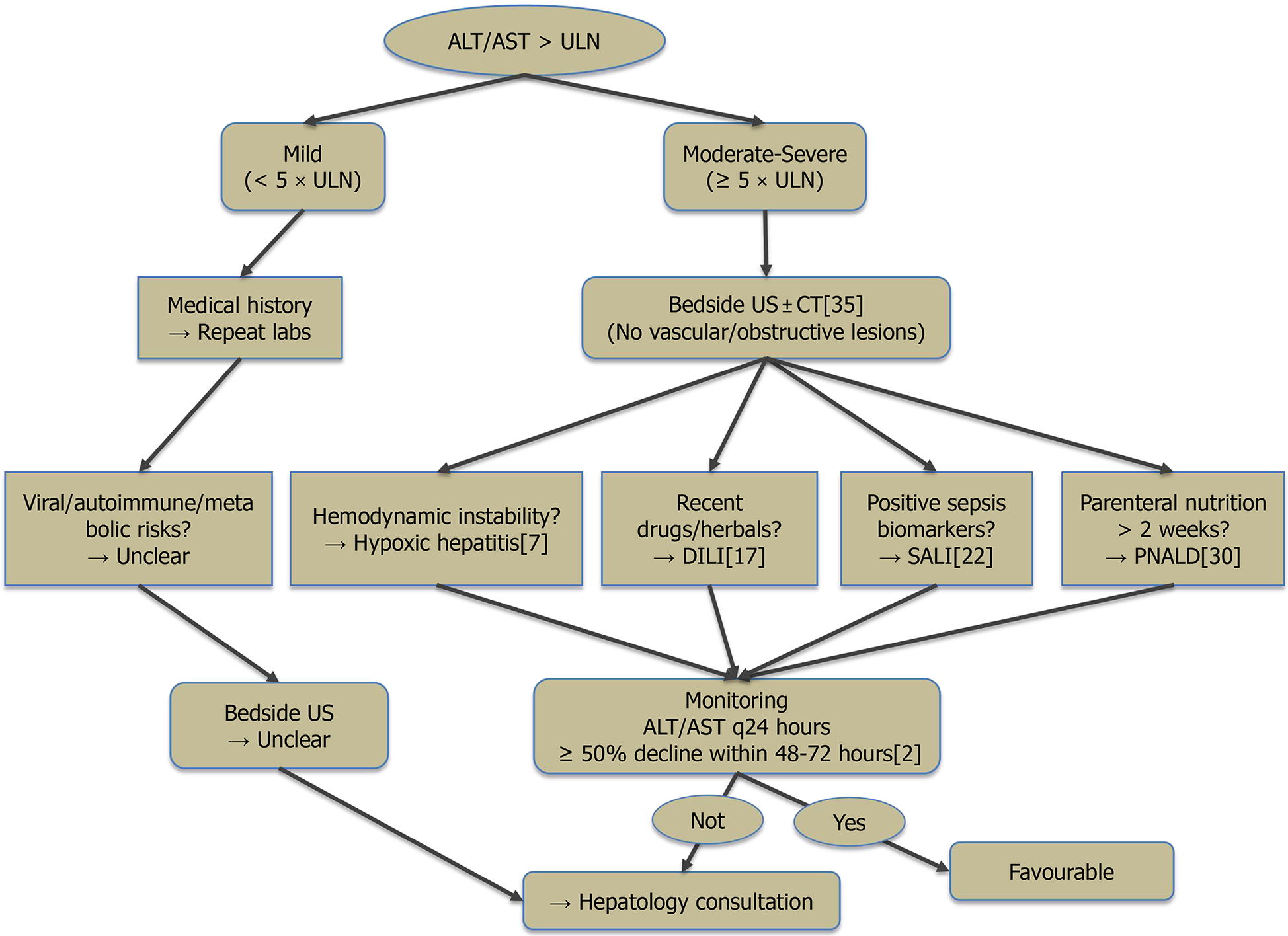 ALT: Alanine aminotransferase; AST: Aspartate aminotransferase; ULN: Upper limit of normal; US: Ultrasound; CT: Computed tomography; DILI: Drug-induced liver injury; SALI: Sepsis-associated liver injury; PNALD: Parenteral nutrition-associated liver disease; q24: Every 24 hours.