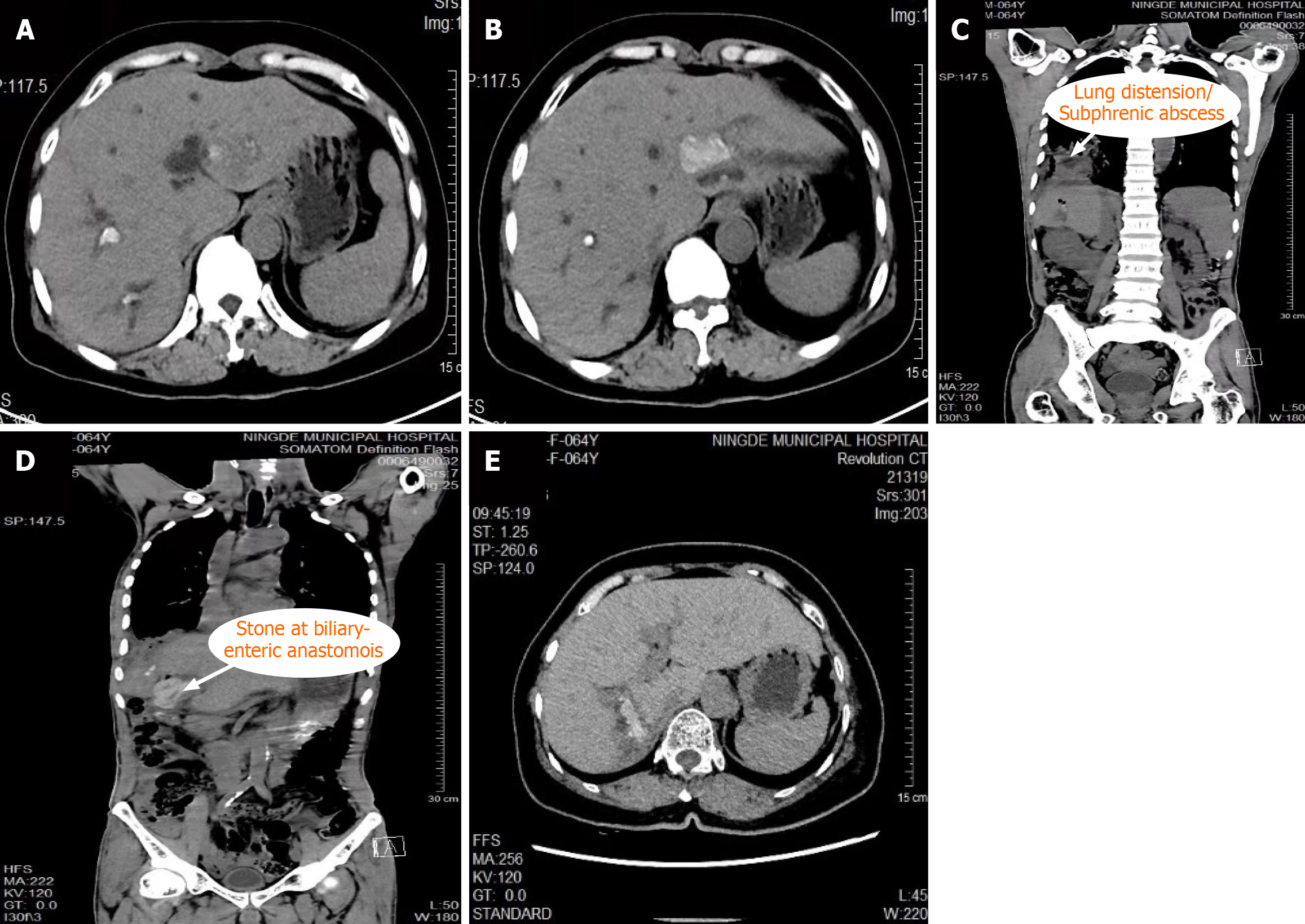 A and B: Preoperative axial and coronal computed tomography (CT) scans showing diffuse intrahepatic biliary stones in the left and right hepatic lobes; C: CT scan demonstrating lung expansion with subphrenic abscess secondary to recurrent cholangitis; D: CT scan showing a retained stone at the site of prior biliary-enteric anastomosis; E: CT scan revealing severe intrahepatic bile duct dilatation accompanied by parenchymal atrophy.