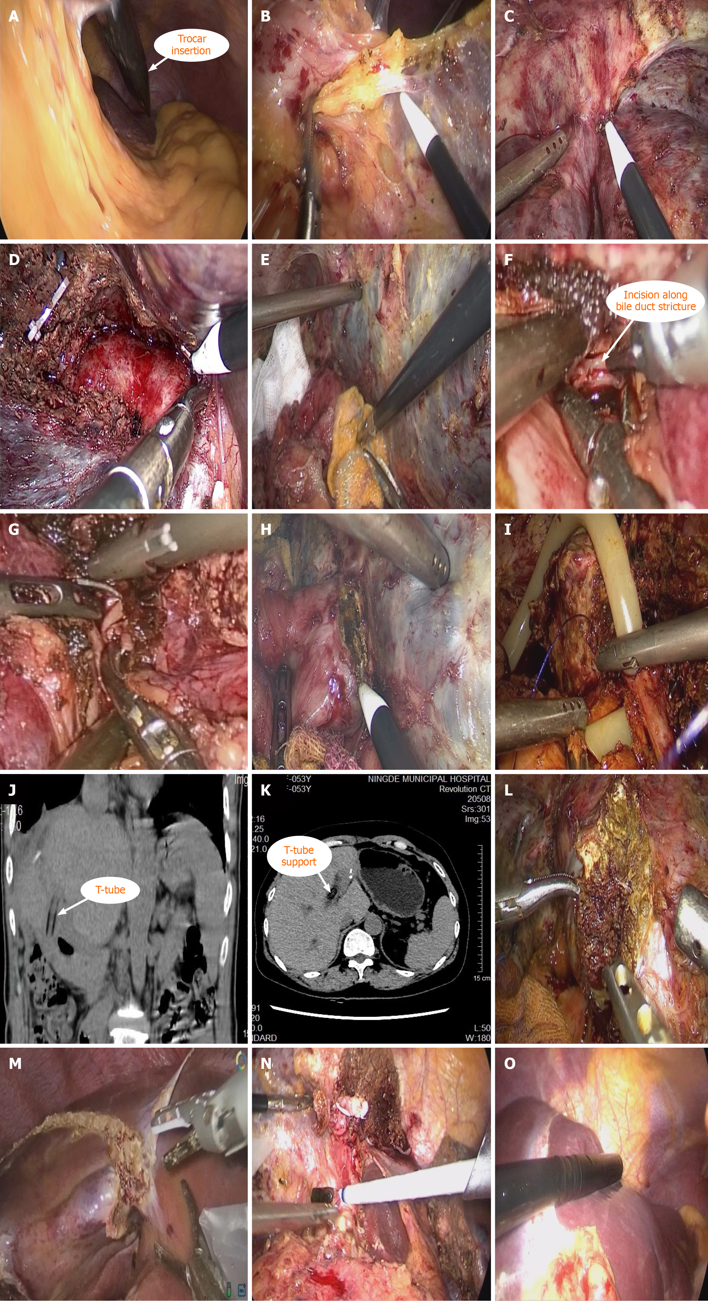 A: Endoscopic view of the laparoscopic trocar insertion site; B: Adhesiolysis along the liver capsule to expose the hepatic hilum; C: Dense adhesion between the liver surface and diaphragm, requiring meticulous dissection; D: Dissection of a dilated bile duct using Laennec’s capsule as an anatomical landmark; E: Placement of iodine-soaked gauze around the anastomosis to prevent intra-abdominal contamination; F: Longitudinal incision of the biliary stricture along its axis; G: Suturing of the incised stricture to restore biliary patency and ensure adequate drainage; H: Exposure of a stenotic bile duct following adhesiolysis; I: Intraoperative placement of a T-tube through the revised biliary-enteric anastomosis; J: Postoperative computed tomography confirming T-tube positioning and biliary decompression; K: Postoperative computed tomography confirming complete stone clearance and hepatic parenchymal integrity; L: Partial resection of liver segments 4b and 5 to access the dilated bile duct; M: Resection of liver segments 4b and 5 to expose the stenotic bile duct; N: Choledochoscopic basket extraction of impacted stones under direct visualization; O: Intraoperative ultrasound localization of stones and adjacent hepatic veins.