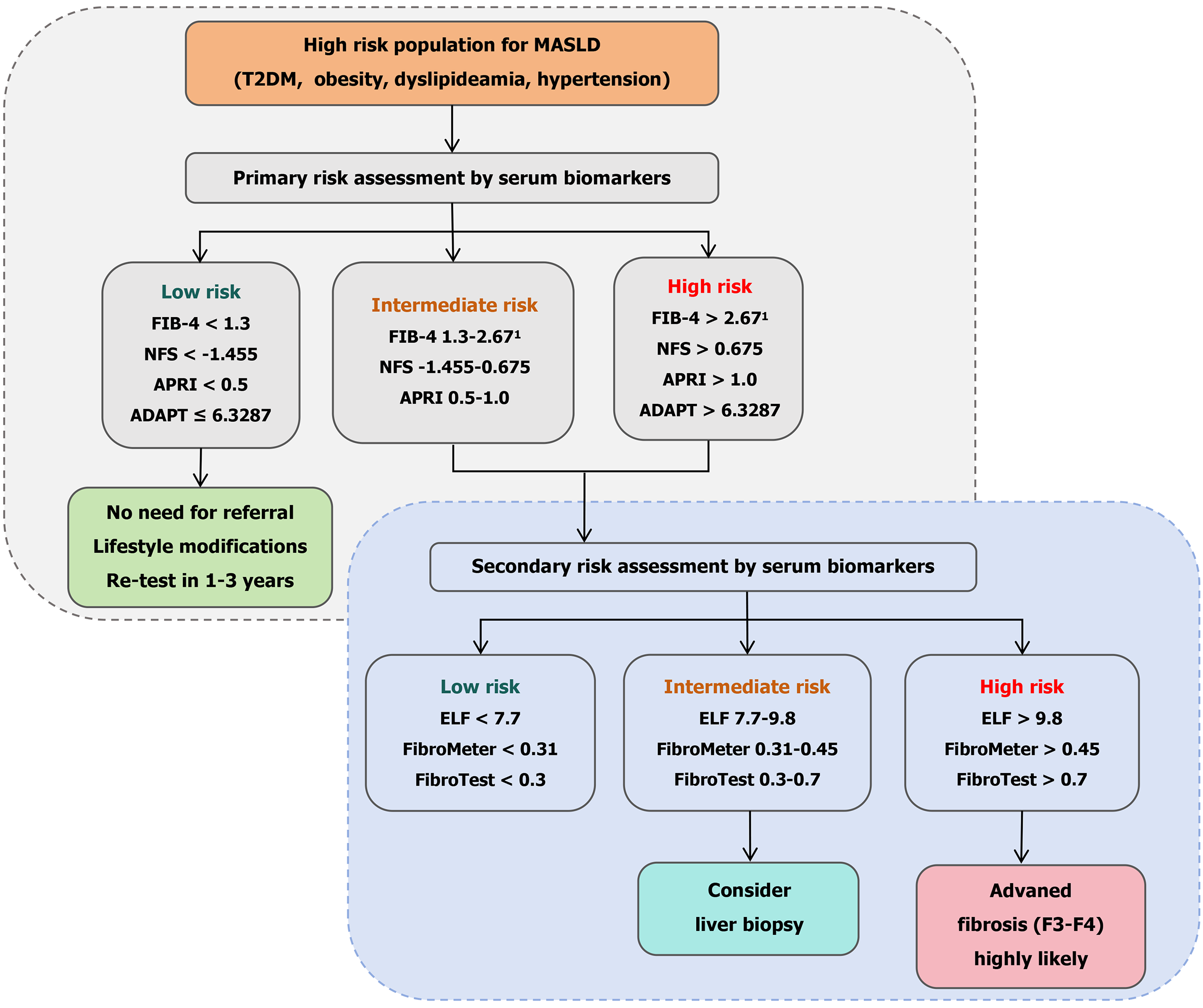 1The cutoff value of fibrosis-4 for individuals ≥ 65 years old is adjusted to 2.0. MASLD: Metabolic dysfunction-associated steatotic liver disease; T2DM: Type 2 diabetes; FIB-4: Fibrosis-4; NFS: Non-alcoholic fatty liver disease fibrosis score; ELF: Enhanced liver fibrosis; APRI: Aspartate aminotransferase-to-platelet ratio index; ADAPT: Age, diabetes status, propeptide of type 3 collagen, and thrombocyte.