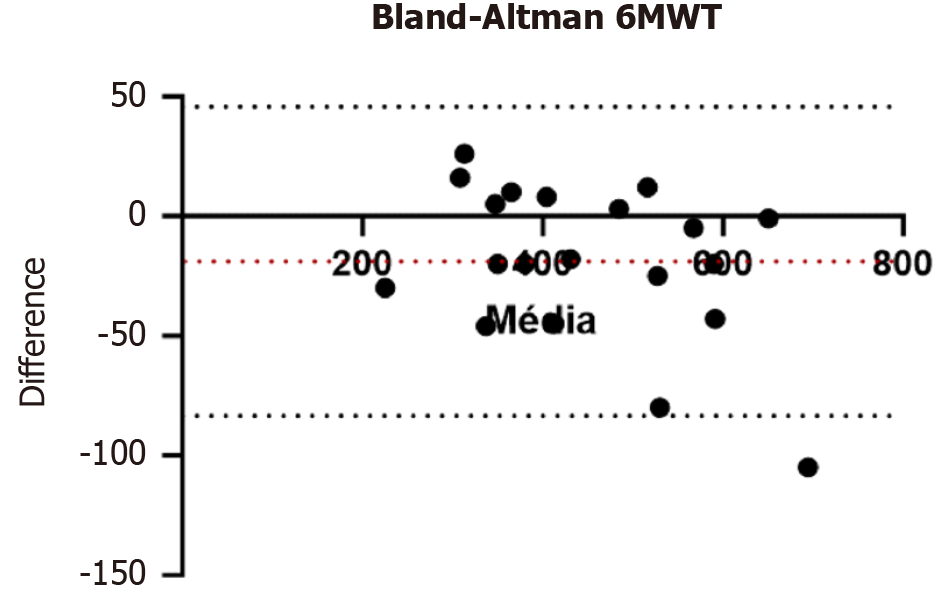 The X-axis shows the mean distance walked by each participant in the two 6-min walk tests. The Y-axis shows the differences between the distances walked by each participant in the two 6-min walk tests. 6MWT: 6-minute walk test.