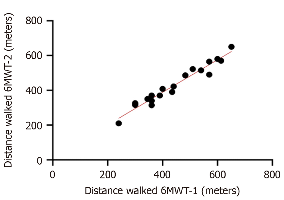 98, P = 0.0001 (n = 19). 6MWT-1: First 6-min walk test; 6MWT-2: Second 6-min walk test.