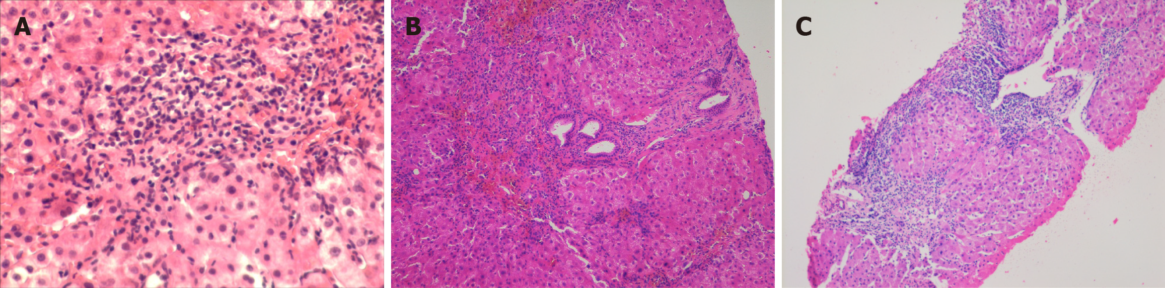 A: A 55-year-old male developed drug-induced autoimmune-like hepatitis (DI-ALH) following treatment with cyproterone acetate. Liver histology demonstrated intense lymphoplasmacytic inflammatory infiltrates and marked interface hepatitis. The patient was treated with corticosteroids for one year, achieving sustained biochemical remission. No relapse was observed during a two-year follow-up period after therapy discontinuation of therapy; B: A 70-year-old female developed DI-ALH following two years of nitrofurantoin therapy. Liver histology showed intense lymphoplasmacytic inflammatory infiltrates, bridging fibrosis, and early parenchymal nodularity. The patient was treated with corticosteroids for six months, achieving sustained biochemical remission. No relapse occurred during a three-year follow-up period after therapy discontinuation; C: A 68-year-old male developed DI-ALH following treatment with levofloxacin. Histological examination of the liver revealed findings consistent with active liver cirrhosis, characterized by intense lymphoplasmacytic inflammatory infiltrates and interface hepatitis. The patient was treated with a combination of corticosteroids and azathioprine for one year, resulting in sustained biochemical remission. No relapse was observed during a four-year follow-up period after therapy discontinuation.