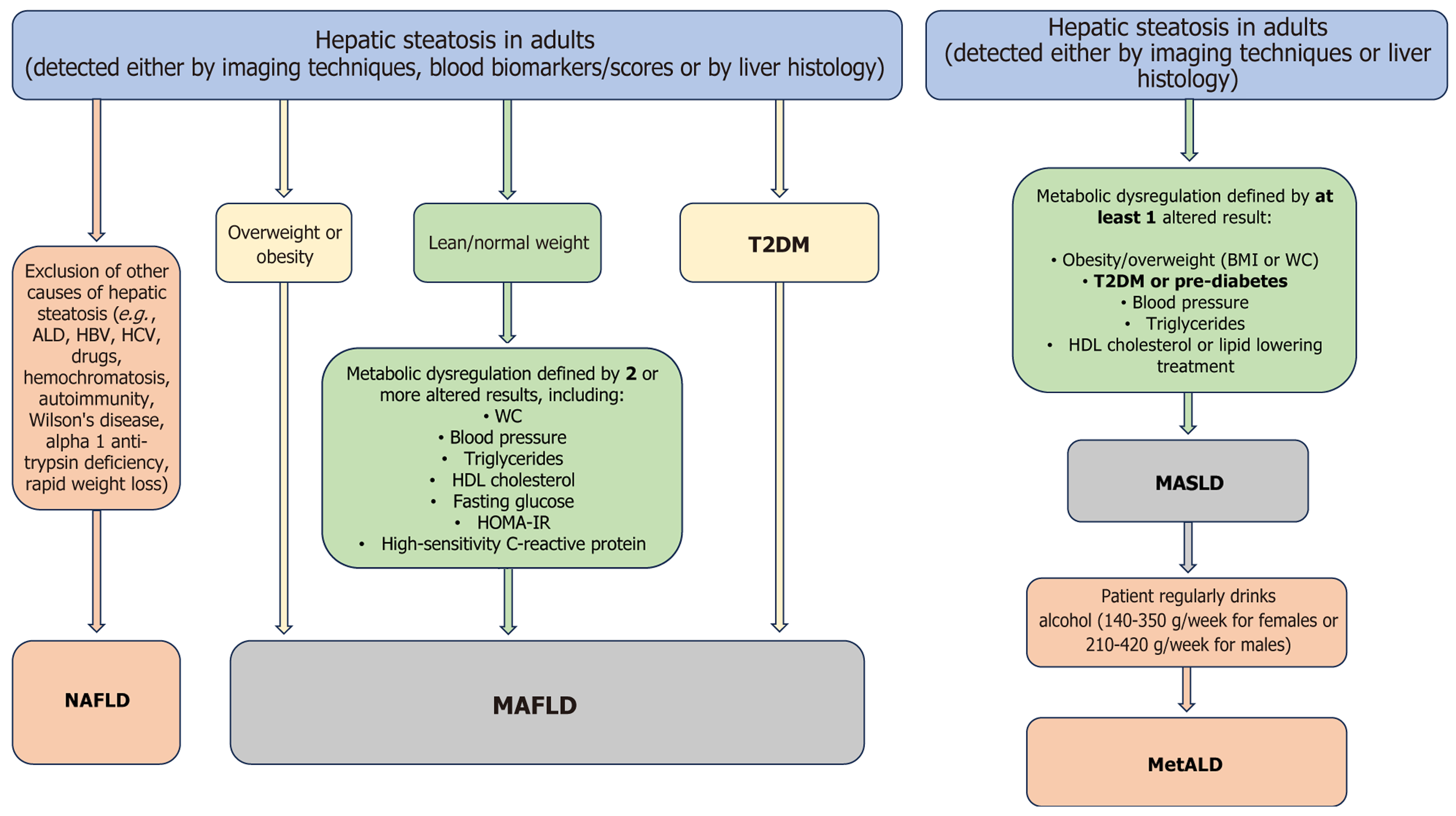 ALD: Alcohol-asso ciated liver disease; HBV: Hepatitis B virus; HCV: Hepatitis C virus; NAFLD: Non-alcoholic fatty liver disease; MAFLD: Metabolic dysfunction-associated fatty liver disease; MetALD: Metabolic and alcohol-associated liver disease; MASLD: Metabolic dysfunction-associated steatotic liver disease; T2DM: Type 2 diabetes mellitus; HDL: High-density lipoprotein; BMI: Body mass index; WC: Waist circumference; HOMA-IR: Homeostatic model assessment for insulin resistance.