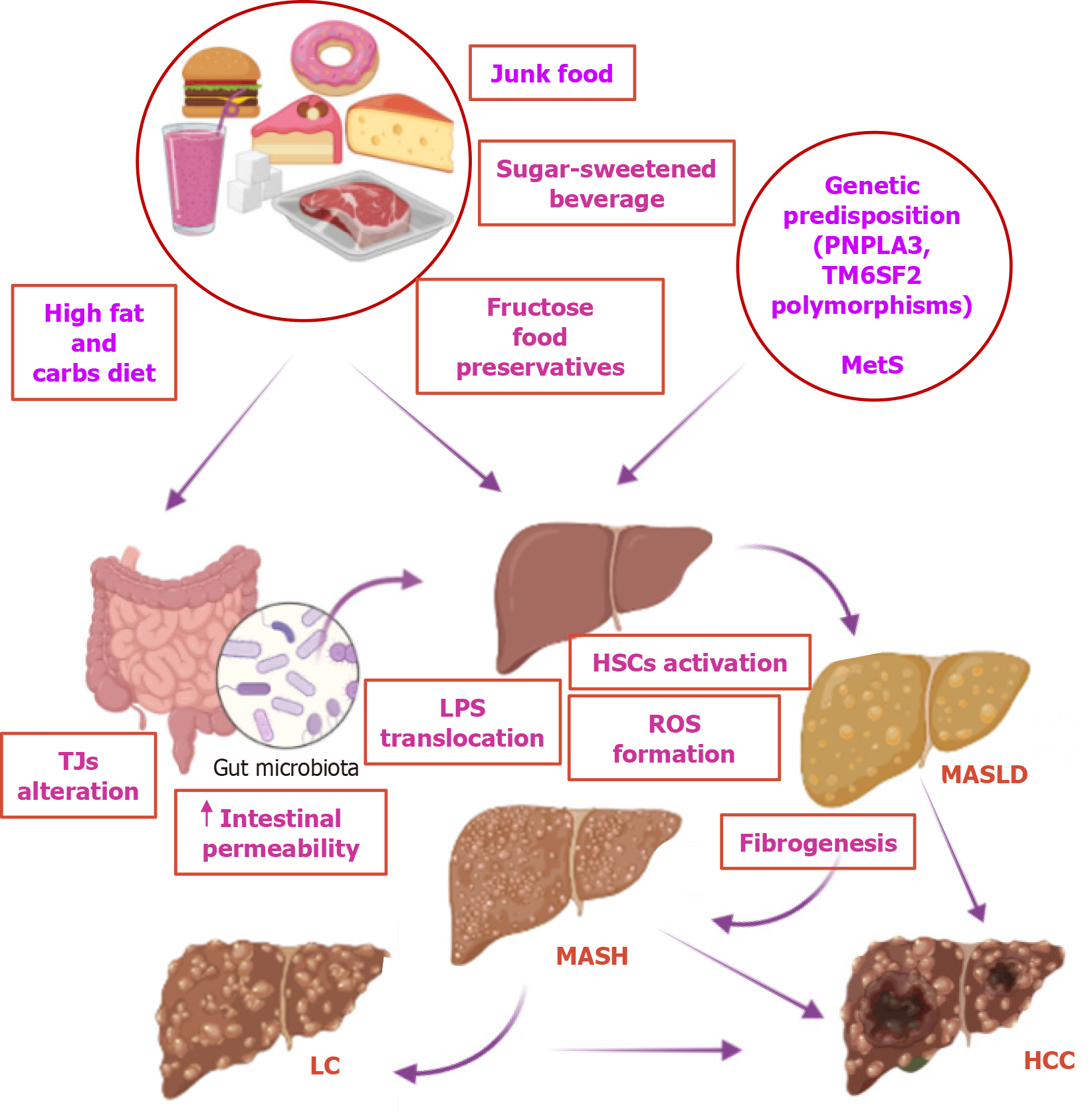 TJs: Tight junctions; LPS: Lipopolysaccharide; HSCs: Hepatic stellate cells; ROS: Reactive oxygen species; LC: Liver cirrhosis; MASH: Metabolic dysfunction-associated steatohepatitis; MASLD: Metabolic dysfunction-associated steatotic liver disease; HCC: Hepatocellular carcinoma.