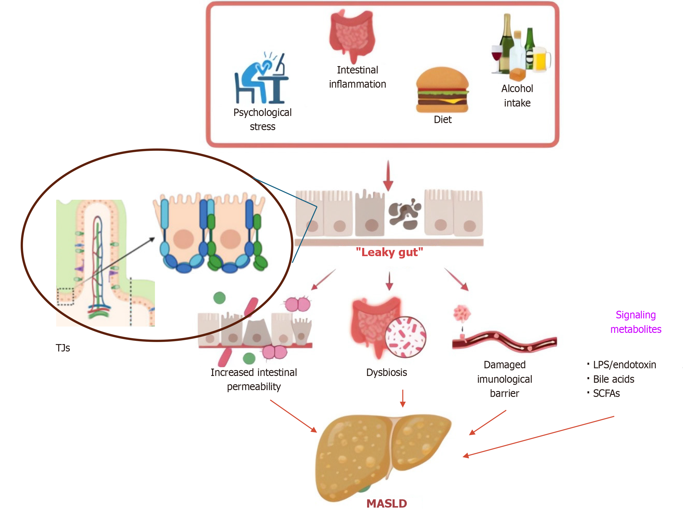 TJs: Tight junctions; LPS: Lipopolysaccharide; MASLD: Metabolic dysfunction-associated steatotic liver disease; SCFAs: Short-chain fatty acids.