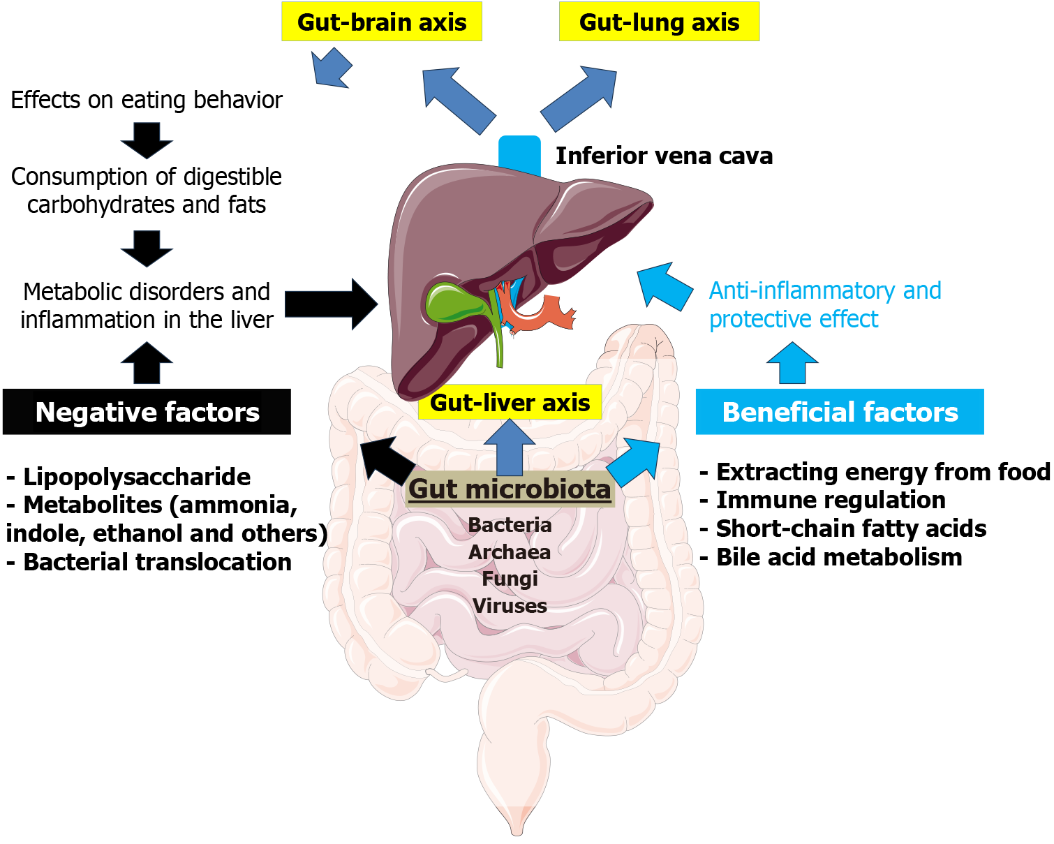 The gut microbiota can have both positive and negative effects on liver function. The gut microbiota has direct and indirect effects on liver function and is involved in the regulation of metabolism and immunity through metabolite production, bile acid metabolism, eating behavior, and regulation of inflammation. The artwork used in this figure was adapted from Servier Medical Art (http://smart.servier.com/) (Supplementary material).