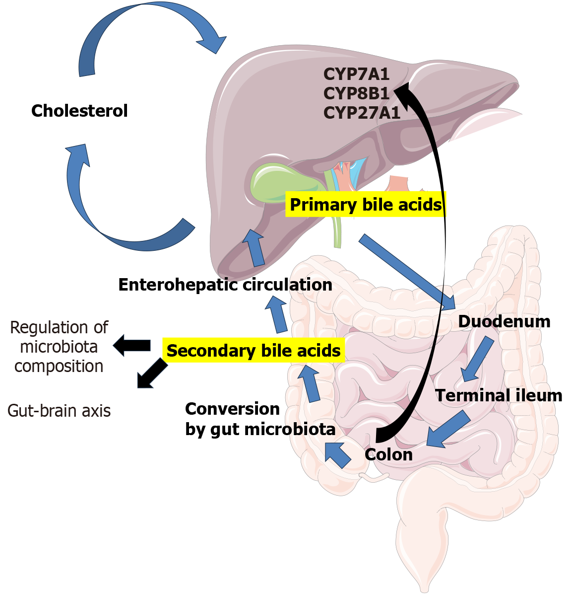 The artwork used in this figure was adapted from Servier Medical Art (http://smart.servier.com/) (Supplementary material). CYP7A1: Cholesterol 7α-hydroxylase; CYP8B1: Sterol 12α-hydroxylase; CYP27A1: Sterol 27-hydroxylase.
