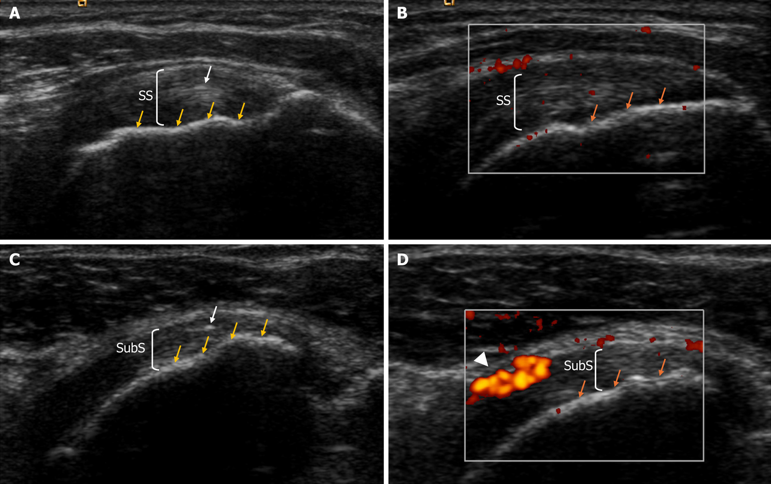 A: Supraspinatus tendon of heterogeneous texture, calcium deposit (white arrow), but no bone cortical damage (yellow arrows); B: Doppler imaging showing isolated mild Doppler signal (red color); no significant signal is observed in the enthesis nor in the bone cortical (orange arrows), indicating the absence of inflammation; C: Subscapularis tendon, calcium deposit (white arrow), but no bone cortical damage (yellow arrows); D: Doppler imaging showing no signal in the enthesis nor in the bone cortical (orange arrows), indicating the absence of inflammation; intense Doppler signal in the subscapularis tendon’s superior fibers (red color, white arrowhead), indicating tendinopathy. SS: Supraspinatus tendon; SubS: Subscapularis tendon.