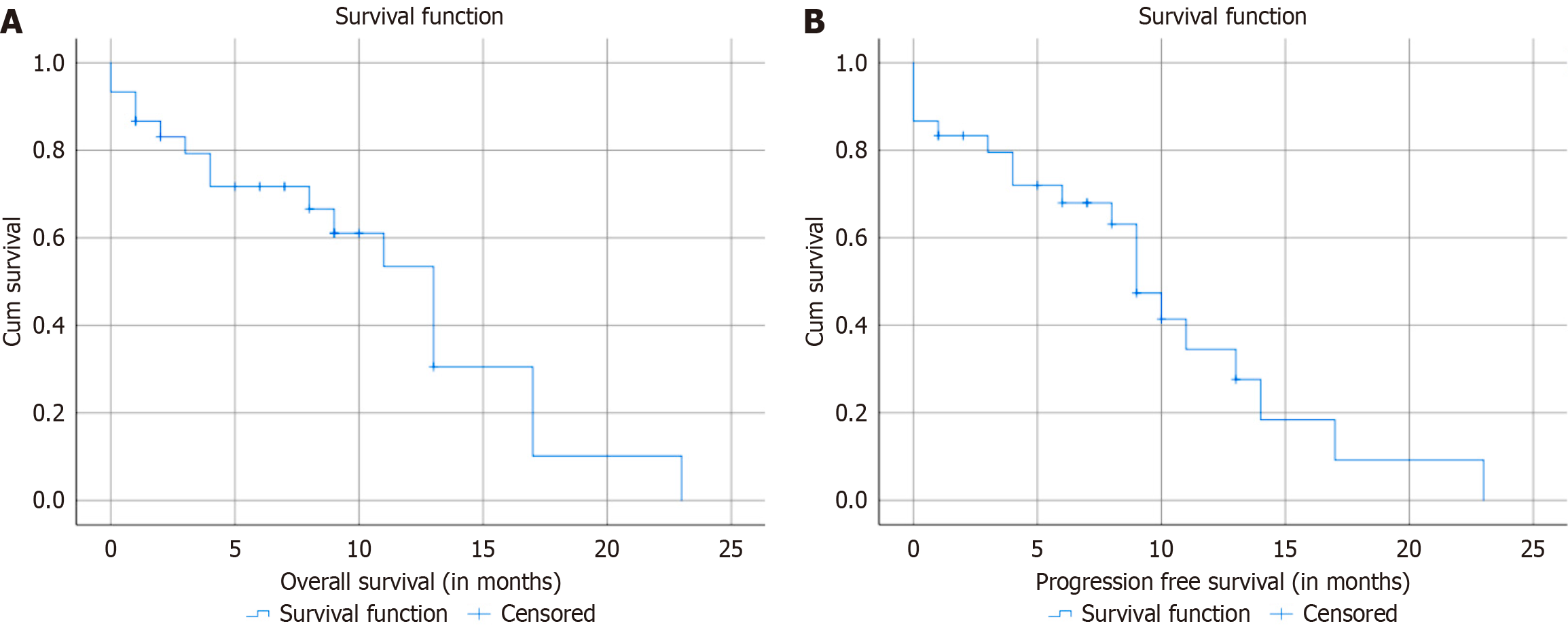 A: Kaplan-Meir curve for the overall survival (in months); B: Kaplan-Meir curve for the progression-free survival (in months).