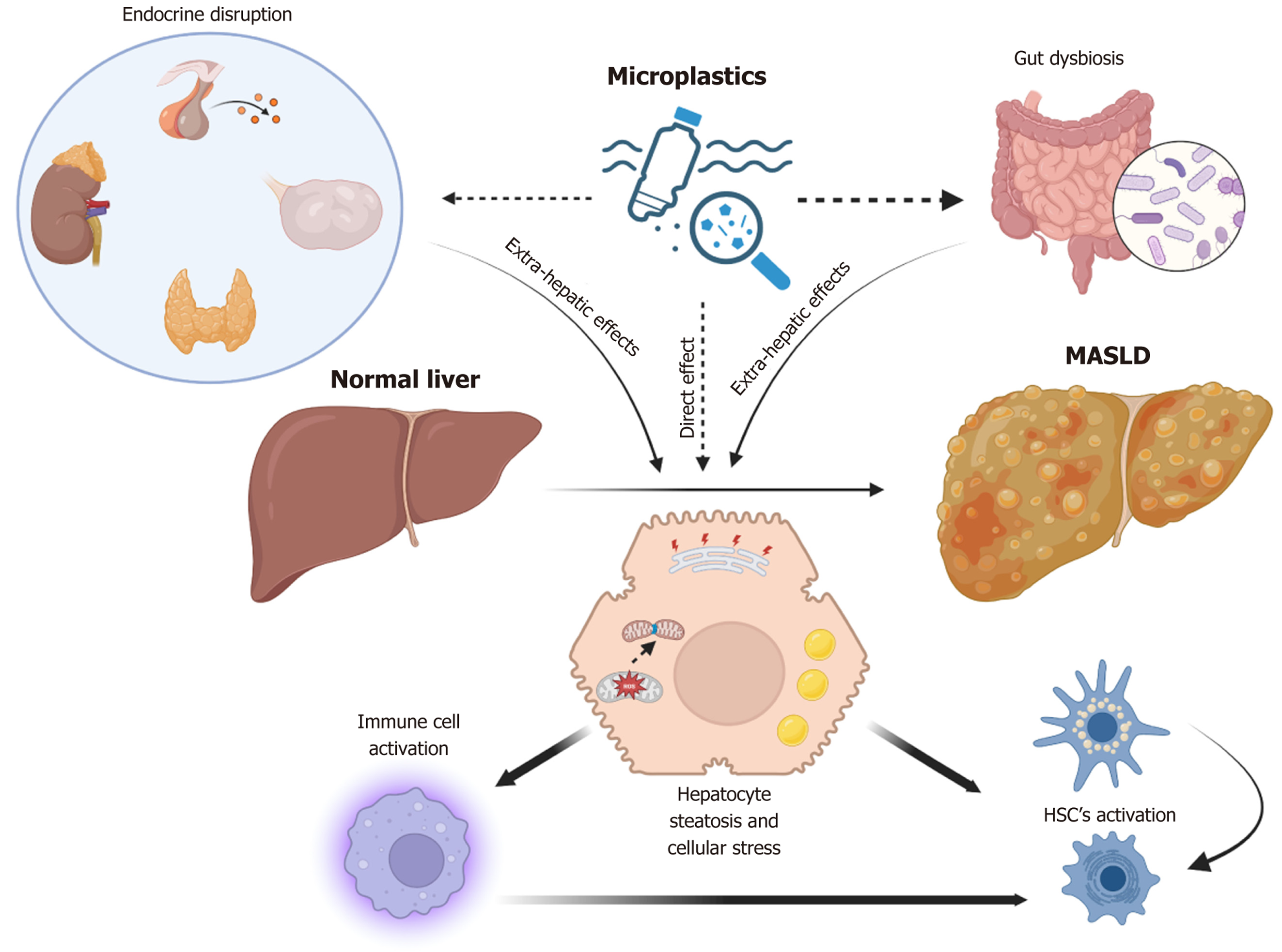 Figure 1 Schematic representation showing both the extra-hepatic and direct hepatic effects of microplastics in contributing to metabolic dysfunction-associated steatotic liver disease progression.