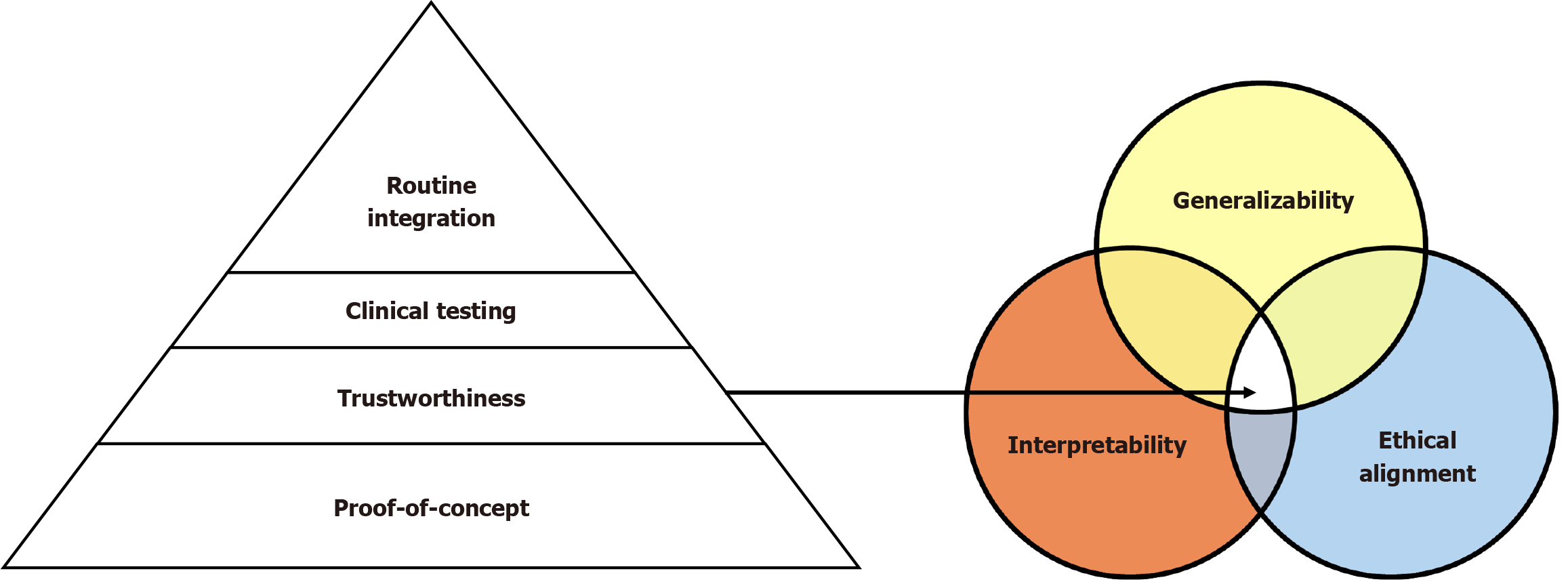 The artificial intelligence (AI) readiness pyramid can be conceptualized in four ascending tiers. At the base lies the proof-of-concept phase, where algorithms are developed and validated in silico or on retrospective datasets. The “Trustworthiness” tier highlights the essential requirement for generalizability, interpretability, and ethical alignment - illustrated through the adjacent Venn diagram. The overlap of these three elements defines an AI system’s trustworthiness, which is a prerequisite for safe and responsible clinical deployment. The clinical testing level represents, encompassing prospective studies and real-world validation. The top tier signifies Routine Integration, where AI systems are seamlessly embedded into clinical workflows and used in daily practice.