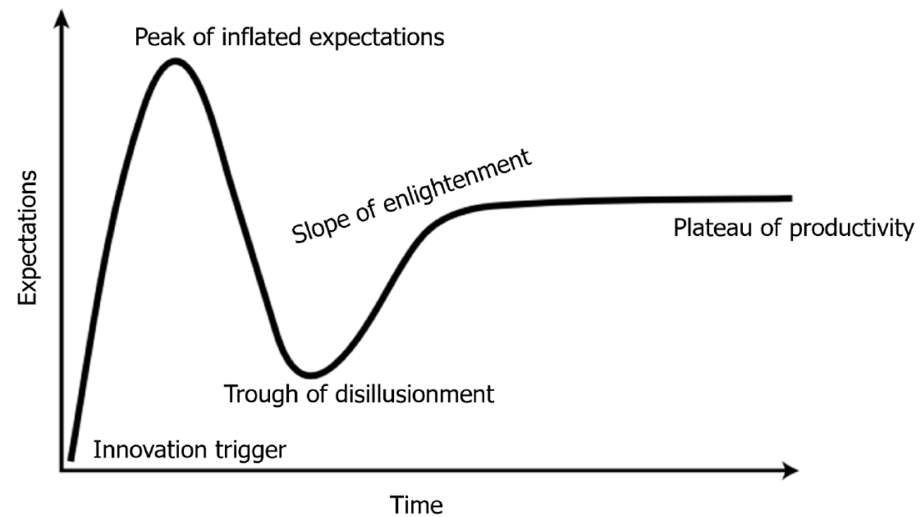 Artificial intelligence innovations typically follow a trajectory from the innovation trigger and peak of inflated expectations, through the trough of disillusionment, slope of enlightenment, and eventually reach the plateau of productivity. Each methodology (e.g., supervised learning, unsupervised learning, reinforcement learning, foundation models) traverses this pathway at its own pace, influenced by data availability, regulatory maturity, interpretability, and clinical need.