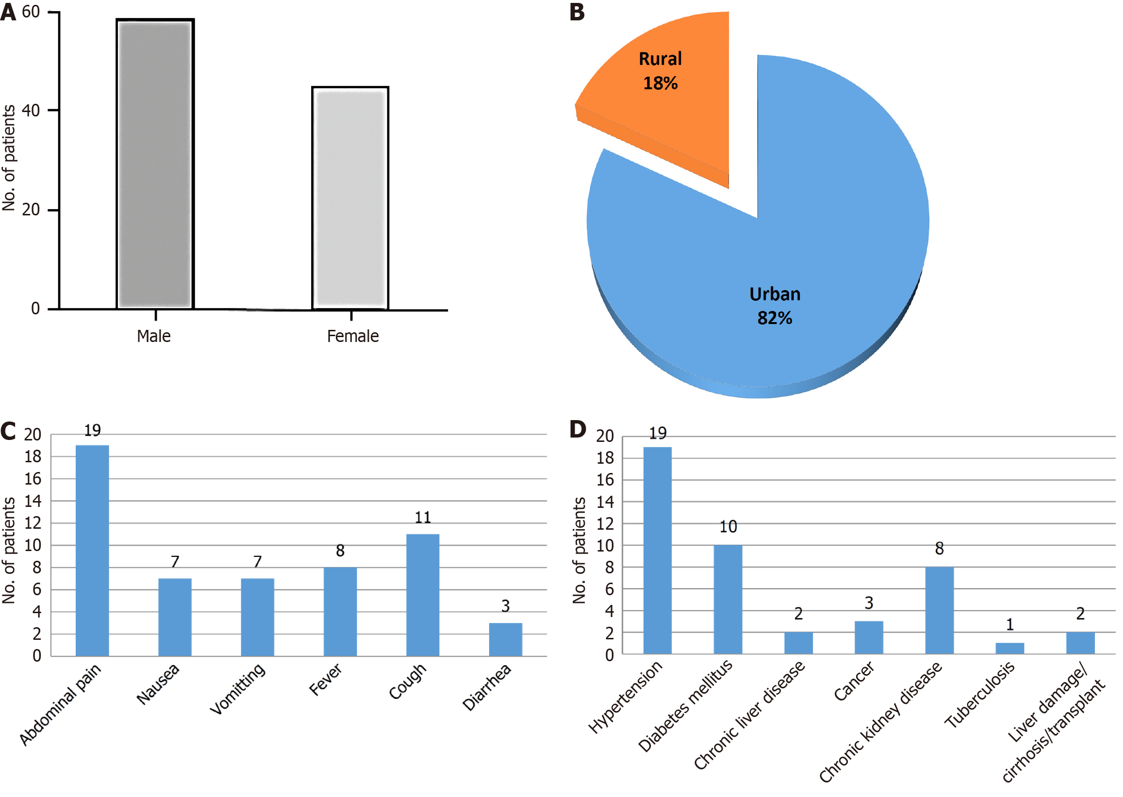 A: Gender distribution in the hepatitis B virus positive group, showing male predominance (male:female approximately 1.8:1); B: Distribution of patient by urban and rural areas; C: Clinical presentations of enrolled study patients; D: Prevalence of co-morbidities in the study population. Data represent the number of patients with specific co-existing medical conditions (e.g., hypertension, diabetes mellitus, chronic liver disease, cancer, chronic kidney disease, tuberculosis and liver damage/cirrhosis/transplant) at the time of enrollment.