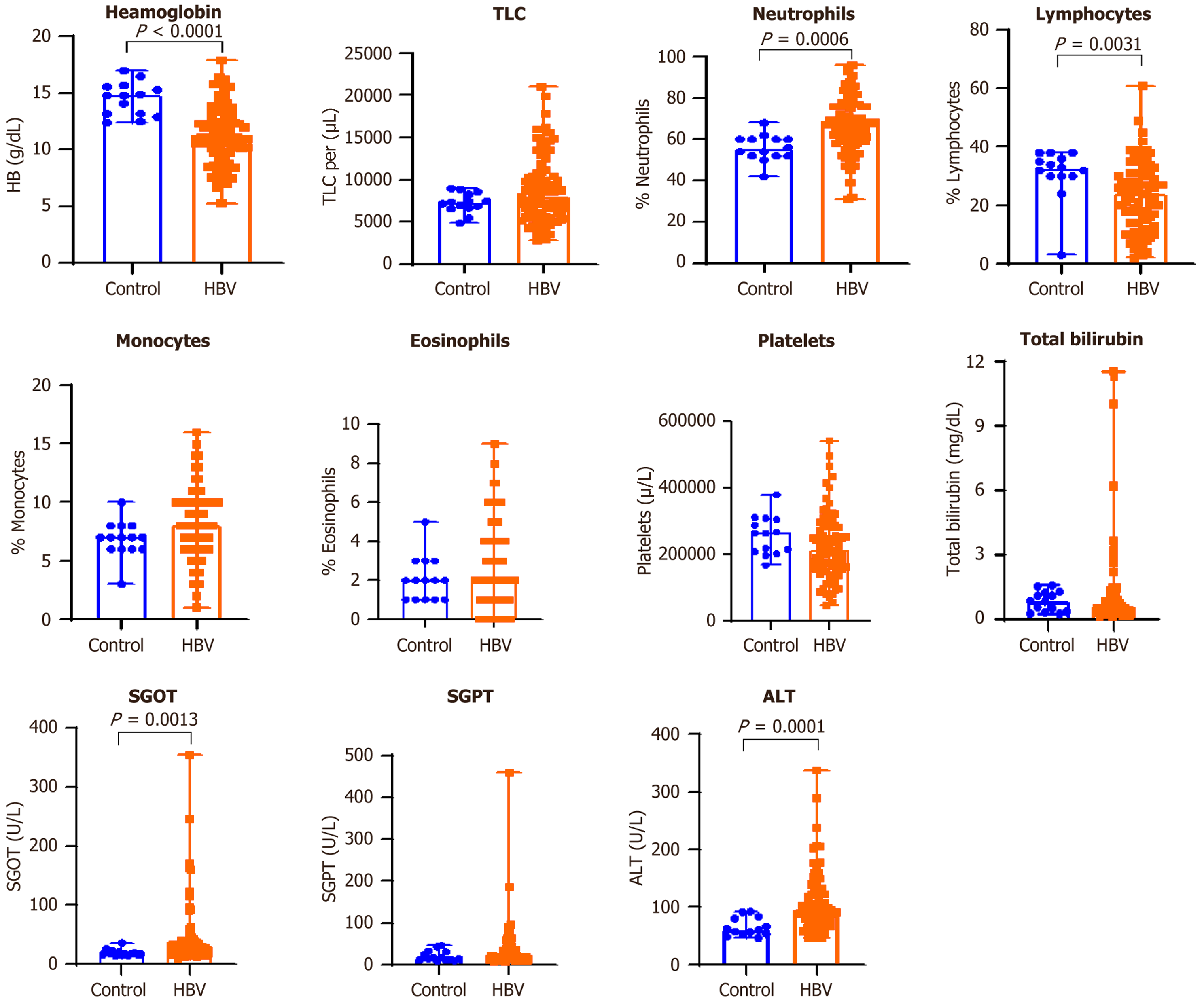 HB: Heamoglobin; HBV: Hepatitis B virus; TLC: Total leukocyte count; SGOT: Serum glutamic-oxaloacetic transaminas; SGPT: Serum glutamic-pyruvic transaminase; ALT: Alanine aminotransferase.