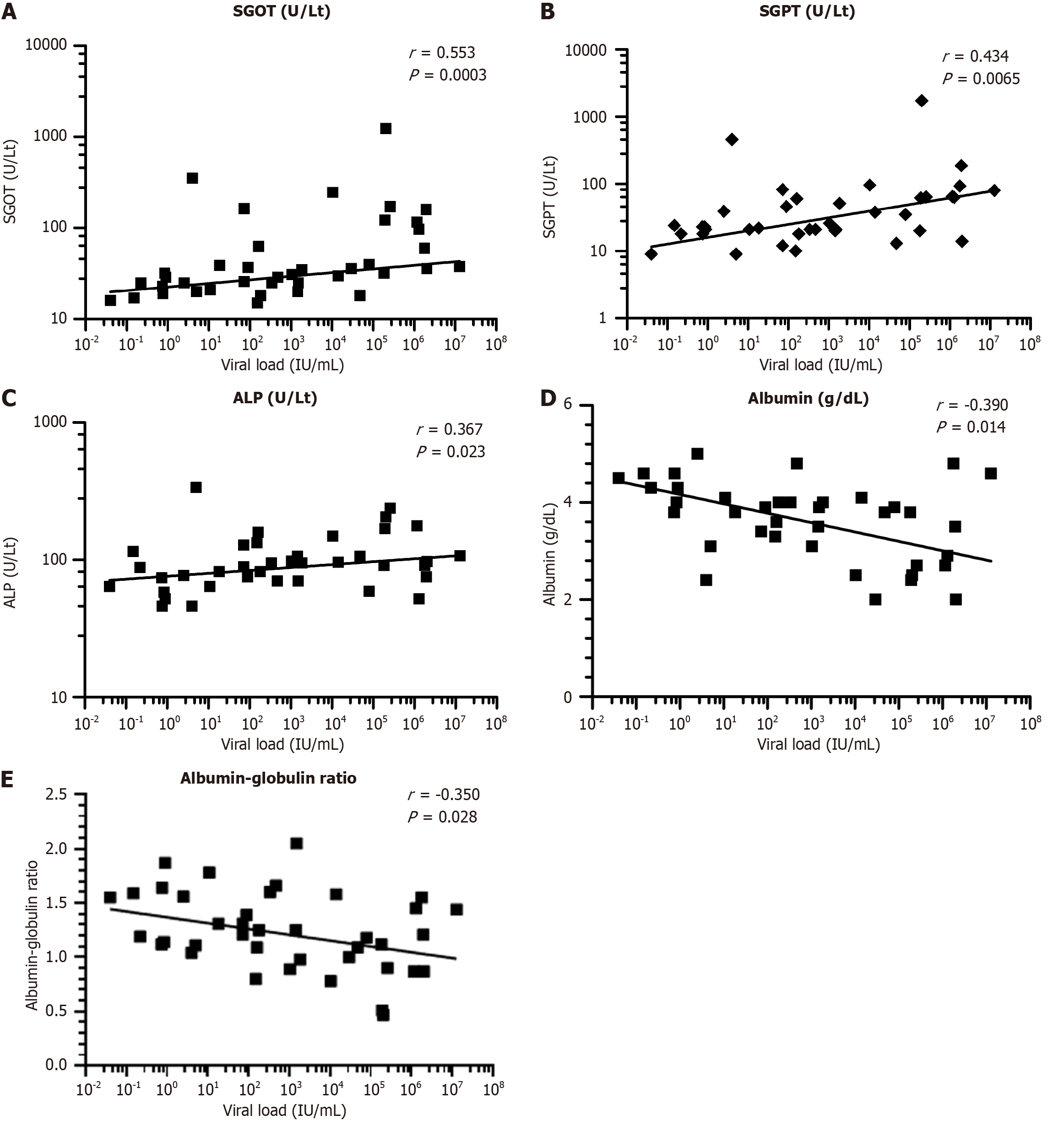 A: Correlation between hepatitis B virus (HBV) viral load and serum glutamic-oxaloacetic transaminas; B: Correlation between HBV viral load and serum glutamic-pyruvic transaminase; C: Correlation between HBV viral load and alkaline phosphatase; D: Correlation between HBV viral load and albumin; E: Correlation between HBV viral load and albumin-globulin ratio. r was calculated using Graphpad prism V 8.0.1 software. SGOT: Serum glutamic-oxaloacetic transaminas; SGPT: Serum glutamic-pyruvic transaminase; ALP: Alkaline phosphatase.