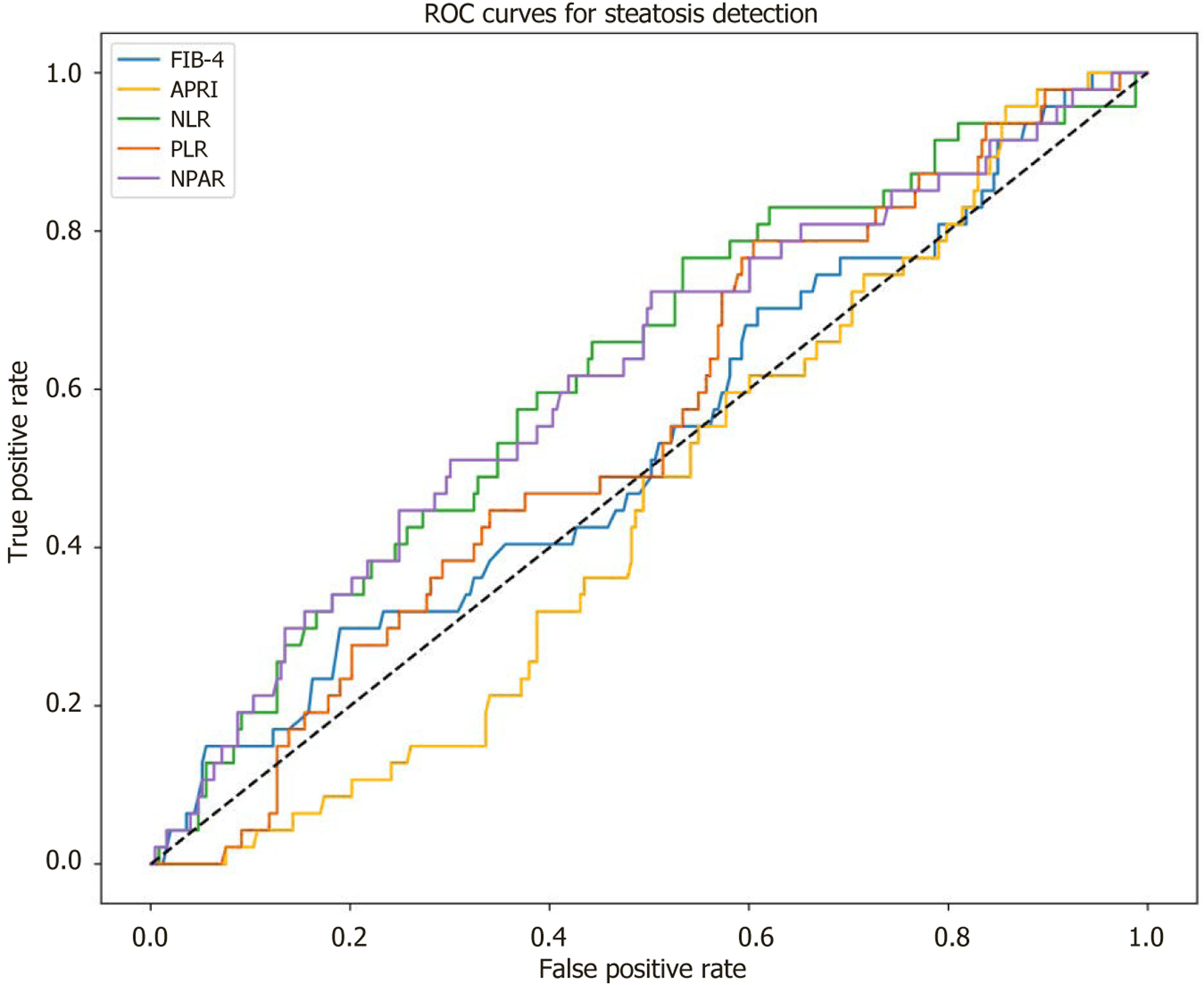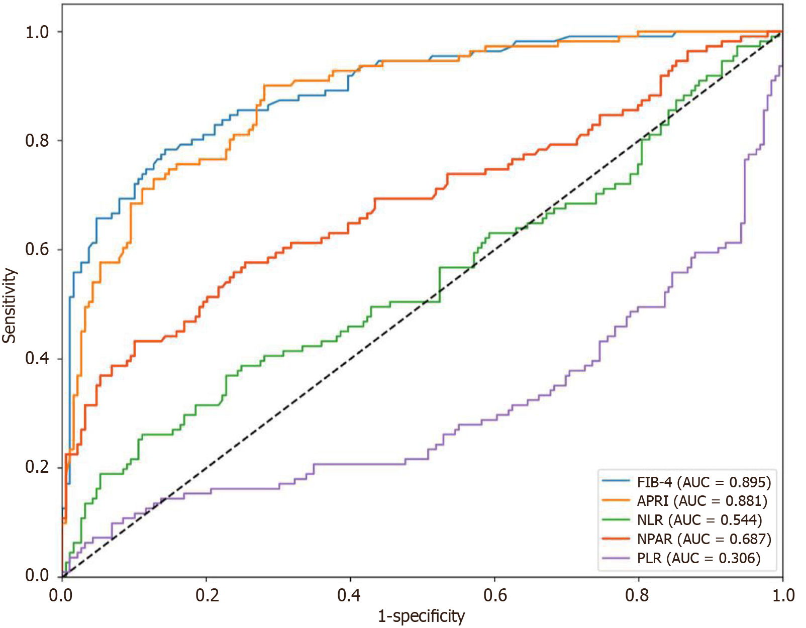 FIB-4: Fibrosis index based on four factors; APRI: Aspartate transaminase to platelet ratio index; NLR: Neutrophil-lymphocyte ratio; PLR: Platelet-to-lymphocyte ratio; NPAR: Neutrophil percentage-to-albumin ratio; ROC: Receiver operating characteristic.